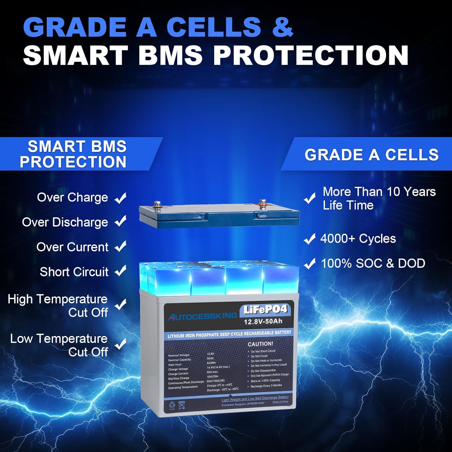 - ✅ BUILT TO LAST - Our 12V 50Ah LiFePO4 batteries are designed to deliver over 2000 deep cycles at 100% DOD, with a lifespan of 10+ years. These batteries provide consistent power across all 50 amp-hours, thanks to their flat voltage curve. Unlike traditional SLA batteries, the power output remains steady as the battery discharges, avoiding the dramatic voltage drop that is common with lead-acid batteries. With a full 50Ah capacity, this battery ensures enough reliable power, making it perfect for applications such as camping, solar, boat, or backup power.