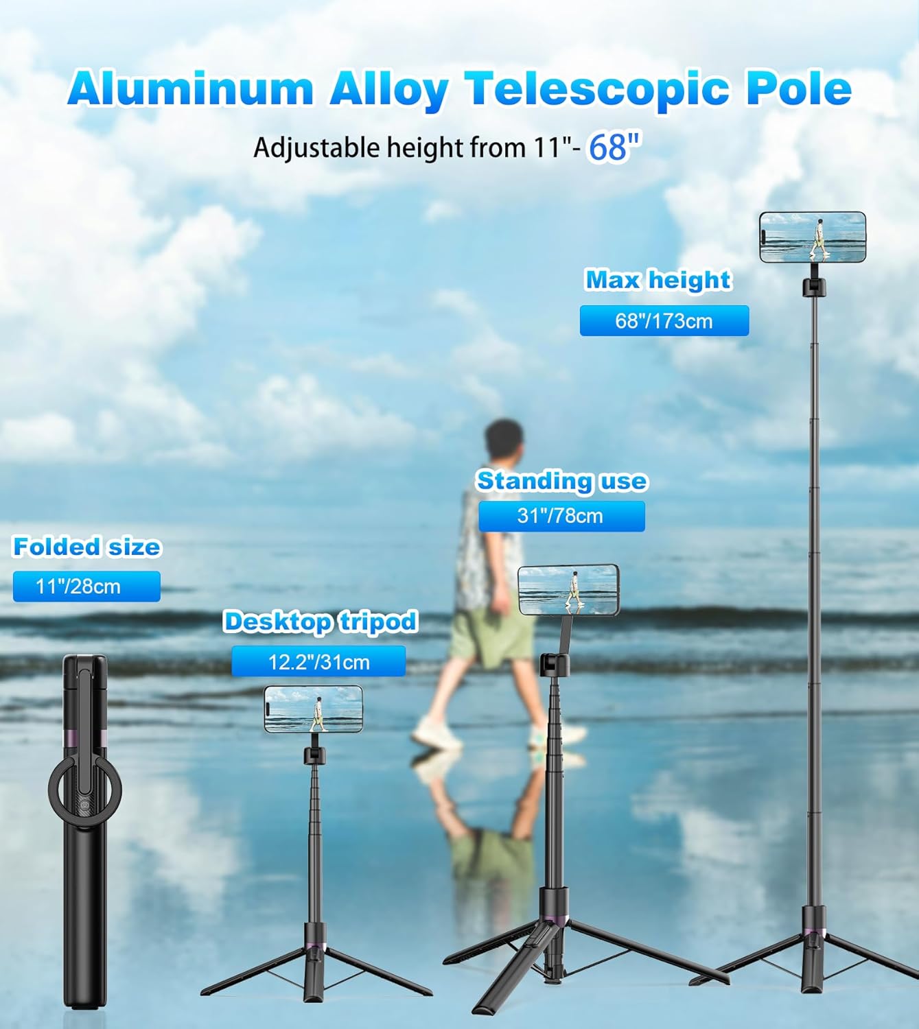 - 3 in 1/Easy to Use - Selfie stick tripod is designed with one-touch unlocking, just press the button on the bottom of tripod and pull telescopic rod. Cell phone tripod consists of 8 sections of retractable rods, the height can be adjusted from 10.8in to 68in, magnetic phone mount ring can hold up to 500g, and can be flexible to take great photos at different heights. You also can switch between desktop tripod, floor tripod and selfie stick modes to easily meet your different shooting needs.