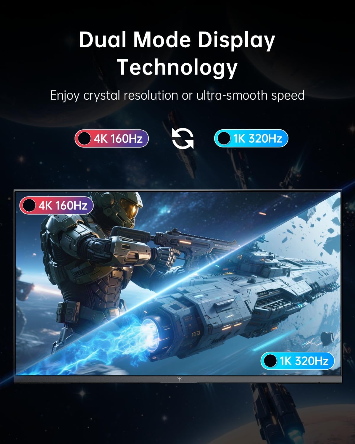 - Dual Mode Monitor: 160Hz 4K Gaming Monitor or 320Hz 1080P Monitor for your choice. Switch the mode to suit your needs best and enjoy ultra-sharp 4K resolution at 160Hz for immersive details or Full HD at 320Hz for ultra-fast smooth gameplay. Ideal for FPS players, console users, or professional gamers.