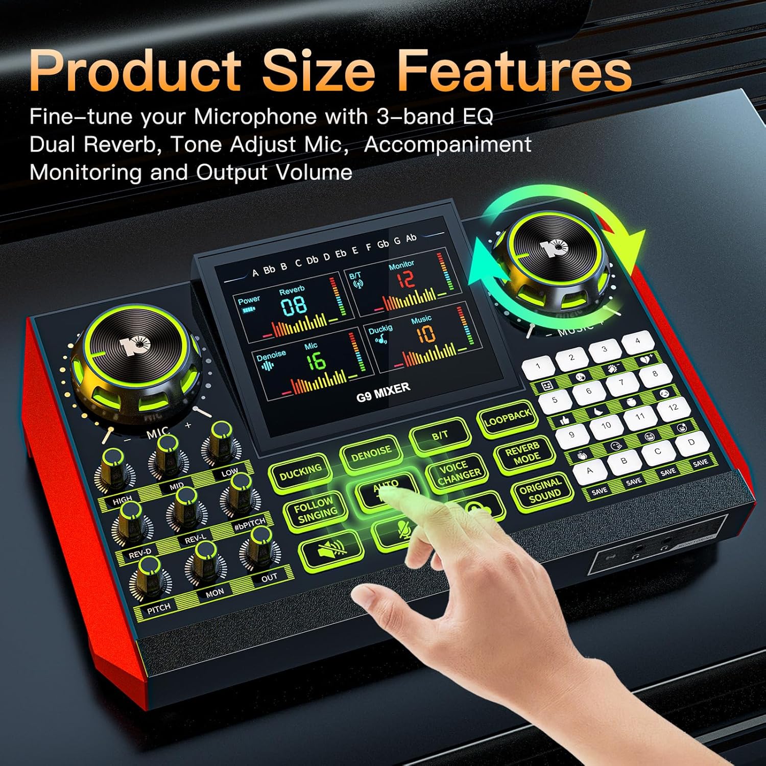 - [EASY TO USE]- G9 sound effect board allows you do all of your audio mixing with onboard hardware. The streaming sound board allows individually control microphone, music, headphone, main output, 3-band EQ, dual reverb, pitch, and more. No need fiddly drivers and complex setup, adjust audio effortlessly, enjoy deeper voice customization, take your podcasting and streaming to new heights, shine your talent to the world.