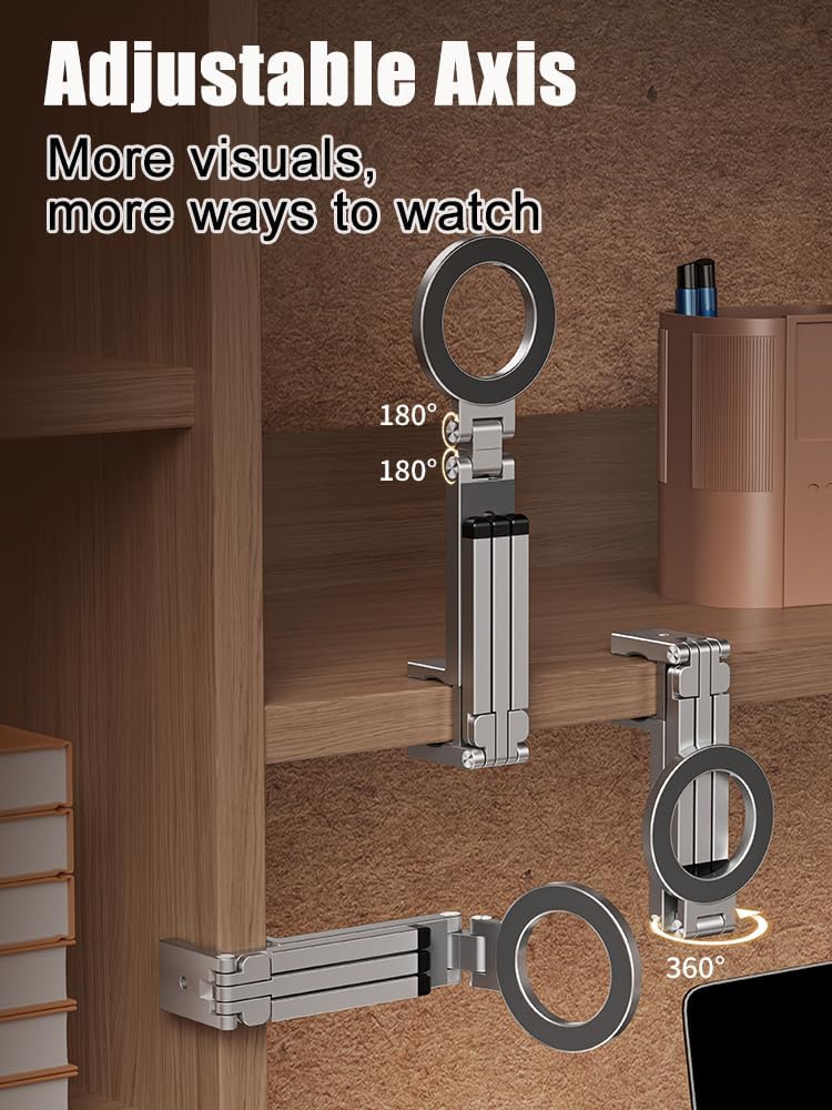 - Multi-Angle Adjustment: Two 180° adjustable bearings are designed underneath the magnetic ring part, and there is also a 360° rotatable bearing between the two axes. The multi-axis adjustable design allows the travel phone tripod to easily meet your angle needs.