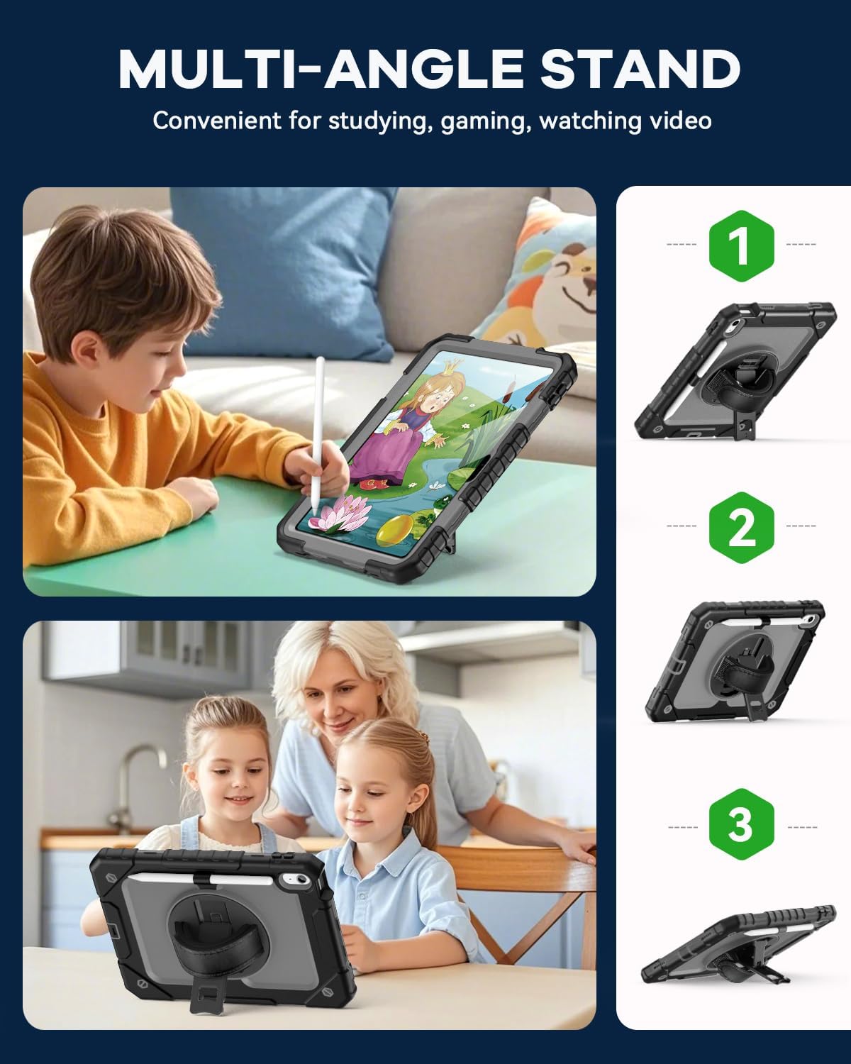 - With Shoulder/Hand Strap & Rotating Stand: The ipad 10th case with portable shoulder/hand strap makes your tablet more conveniently outdoors & indoors, such as display your iPad behind car head rest. 360 degree rotating kickstand provides different typing & viewing angles for studying, gaming, watching video, etc.