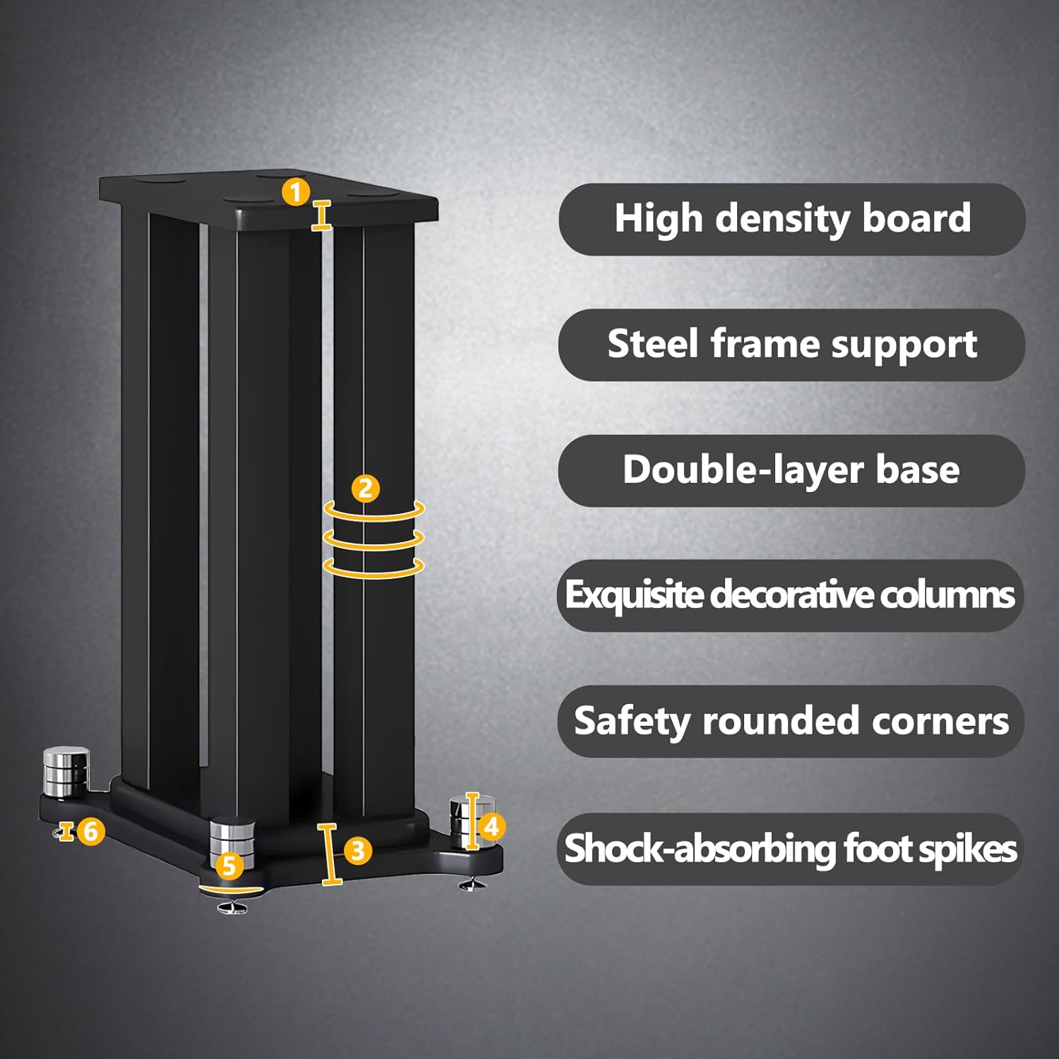 - MODERN AND VERSATILE – The double-layer base of the speaker stand features four decorative stainless steel columns. It's stylish and simple, fitting into any home décor, whether it's a living room, bedroom, or music room