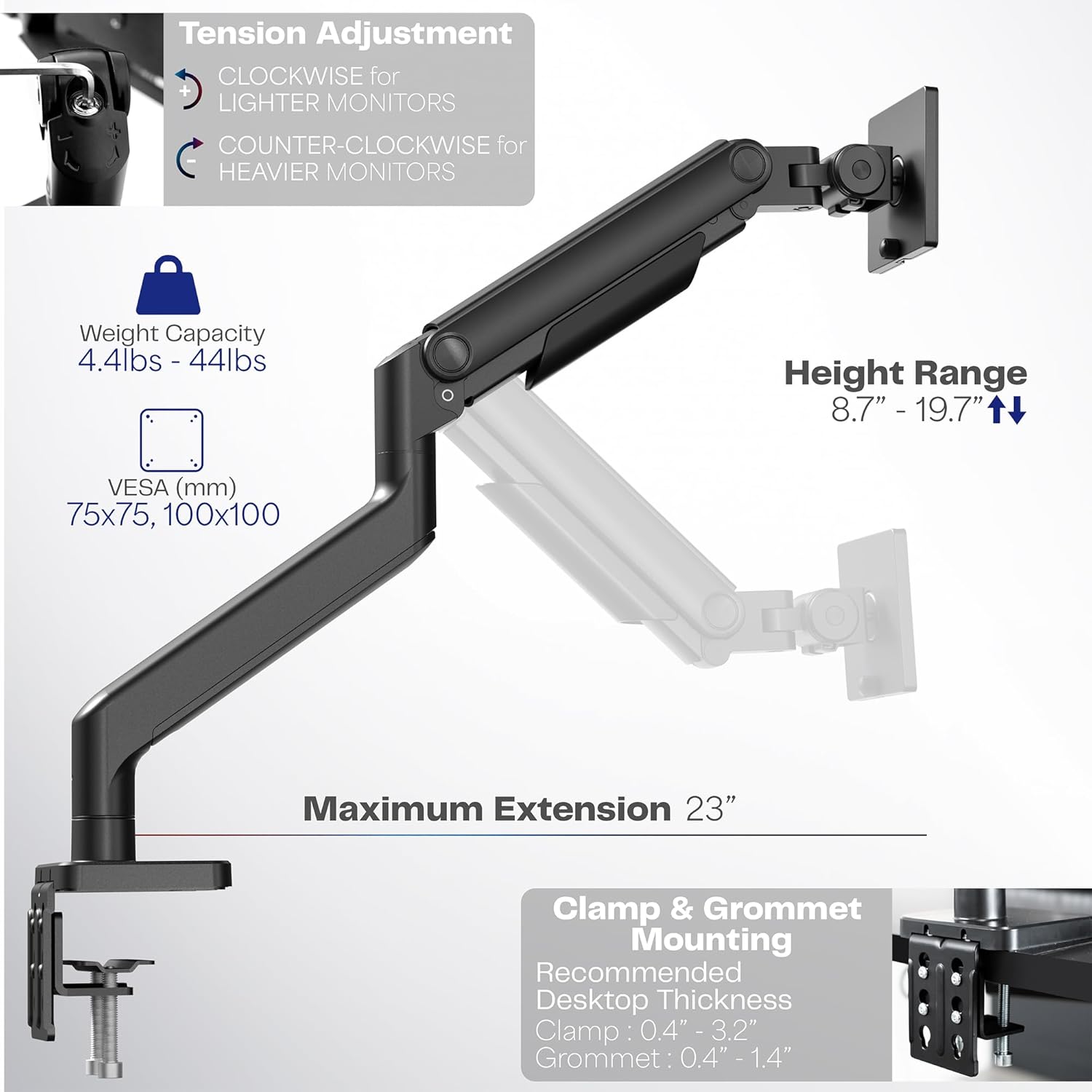 - Premium Tension Arm Gaming Mount: Premium spring-assist arm counterbalances the weight of your monitor for optimal ergonomic height adjustments. Ideal for gaming setups, this heavy-duty mount repositions large screens at the touch of a hand
