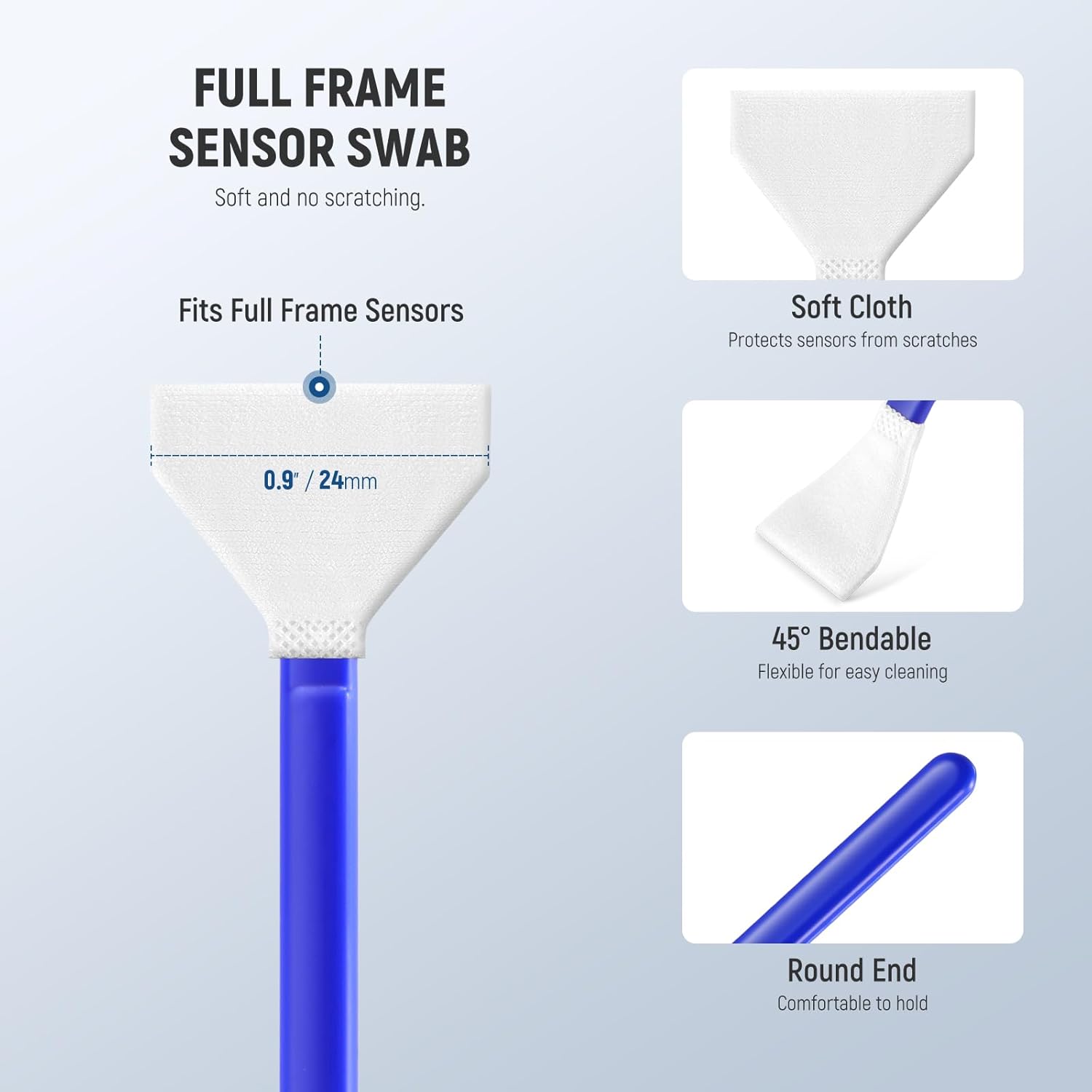 - 【24mm Full Frame Sensor Swab】 The vacuum sealed swab is specially designed for 24mm full frame sensor CCD/CMOS units. With a soft microfiber tip and a flexible grip, the swab can safely clean the sensor without damage, also ideal for monitors, displays, printers, and other delicate electronics