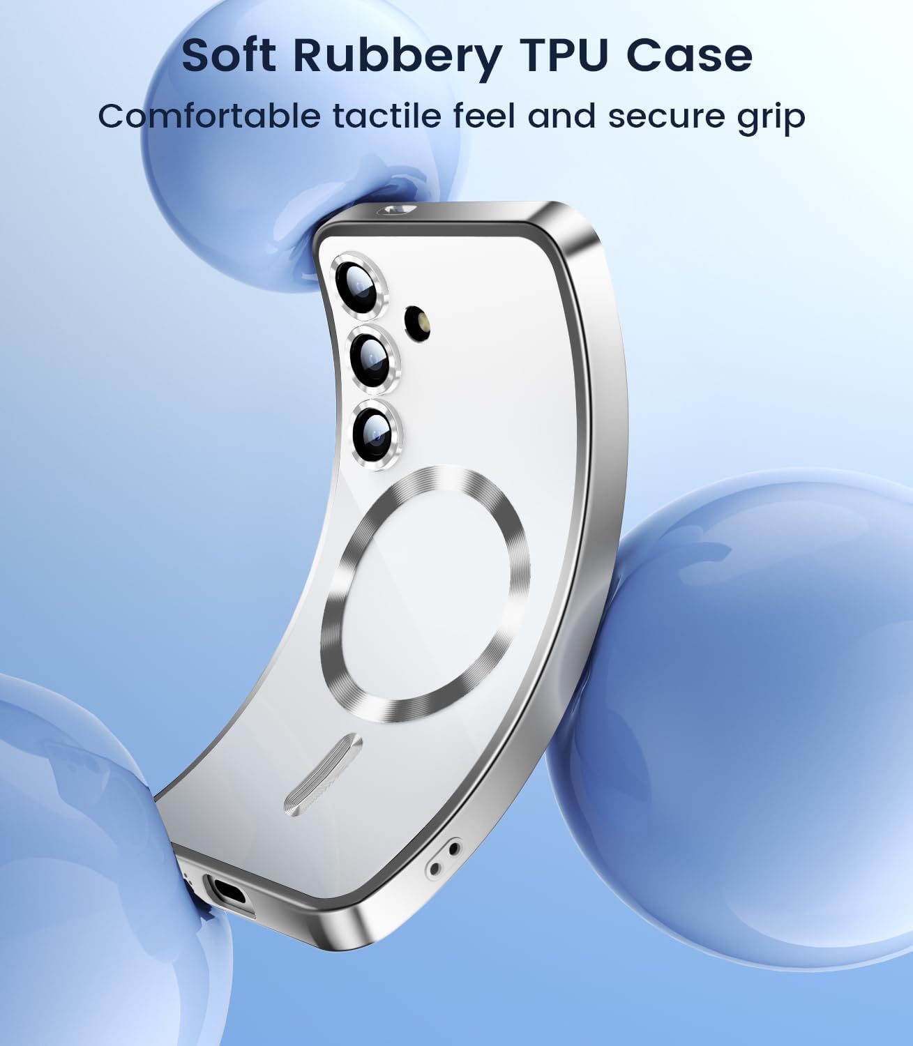 Slim Thin for Samsung Galaxy S25 Plus Case, Compatible with MagSafe, Built-in Camera Lens Protector, Shockproof Protective Phone Case, Soft Electroplated Clear Cover, Silver