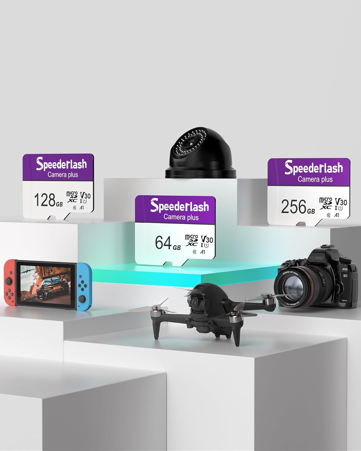 Micro SDXC Memory Card 64GB, Speederlash Camera Plus TF Card with Adapter, Up to 90MB/s Read Speed, 4K UHD&5K Video Support, U1 V30 A1 Rated, Waterproof, for Security Camera, Dashcam, Drones