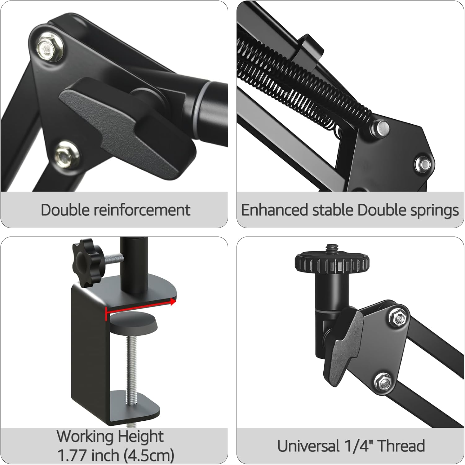 - ROBUST CLAMP and BROAD COMPATIBILITY : Desk clamp opens to 70 mm (2.75") with anti-slip foam + silicone pads to protect surfaces; quick to reposition between home office, studio, dorm, or workshop. Phone holder fits 2.4–3.93" width (iPhone 15 Pro Max, Galaxy S24 Ultra, Pixel 8a, etc.). 1/4" screw mount supports cameras, action cams, mini LEDs, or mics up to 2 lb (0.9 kg)—great for tabletop overheads, stop-motion, recipe reels, craft detailing, and macro product shots