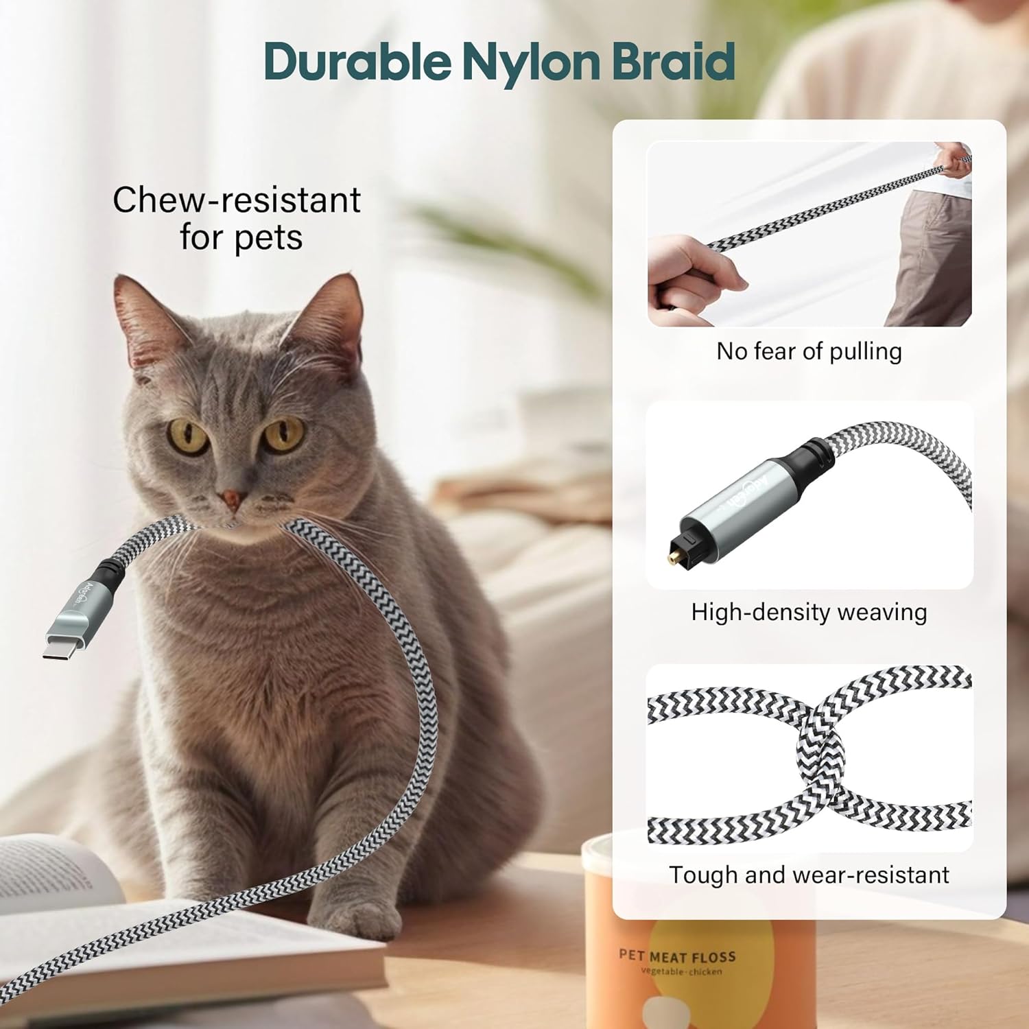 - 【Unidirectional USB C to Toslink Digital Optical; Not Toslink to USB】Our Advantages: Plug & Play, no driver installation or external power supply required—ready to use upon connection ---- Alloy Housing & Gold-Plated Connectors: Excellent heat dissipation, wear- and scratch-resistant, reduces electromagnetic/RF interference, provides stable signal and oxidation resistance for extended lifespan ---- Nylon Braided Jacket: Excellent texture, tangle-resistant, flexible and durable, enhances tensile strength and environmental adaptability, ensuring longer service life ---- Both terminals come with plastic protective caps to keep out dust and dirt when not in use, preventing oxidation or corrosion