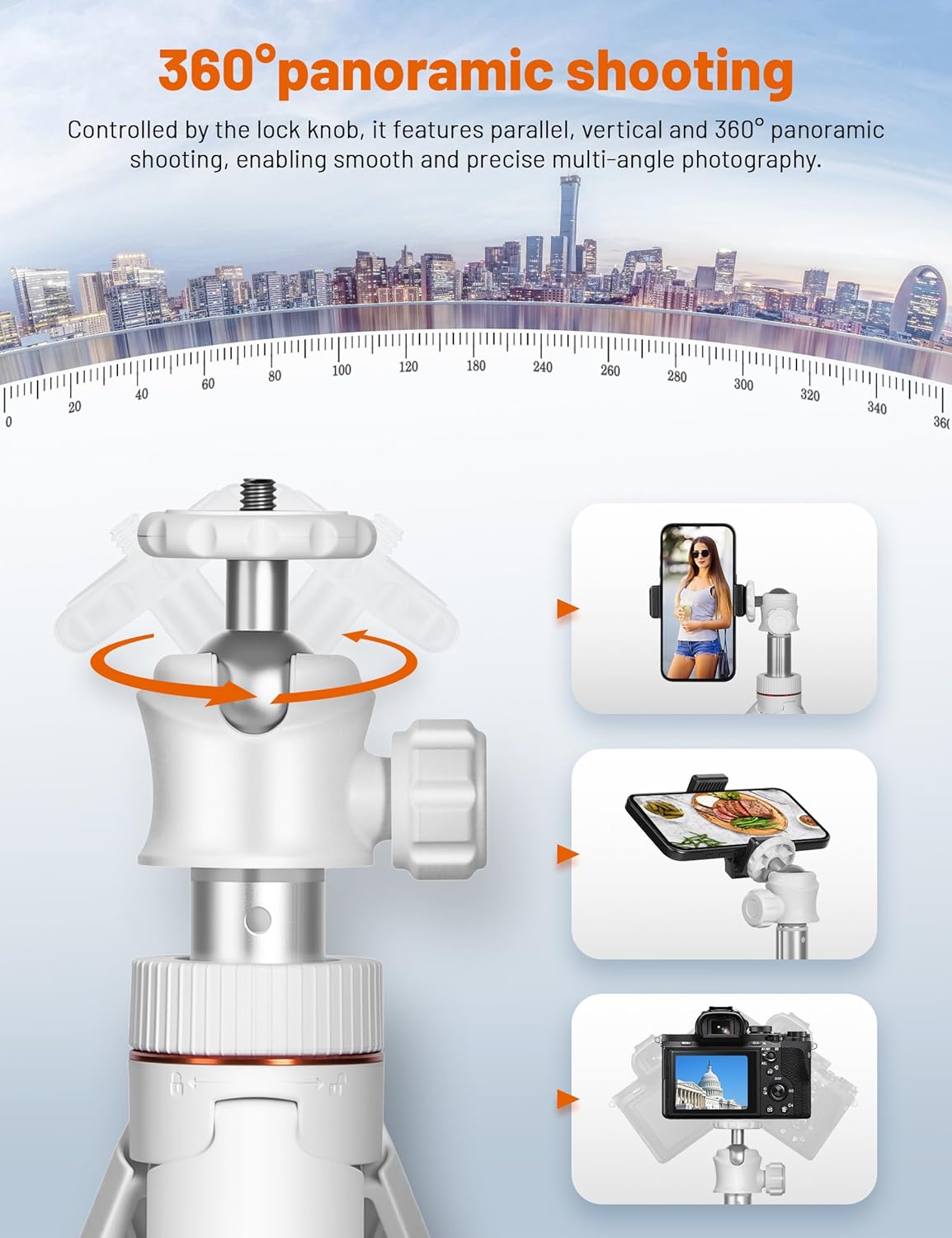 - 360° Rotatable Ball Head Camera tripod: Joilcan selfie stick features a 360° rotatable ball head, allowing you to effortlessly switch between panoramic shots (360°), portrait mode (180°), high-angle overhead shots, and low-angle captures. The knob-adjustable locking mechanism ensures your phone stays securely fixed at any angle. Phone tripod meets all your angle needs.