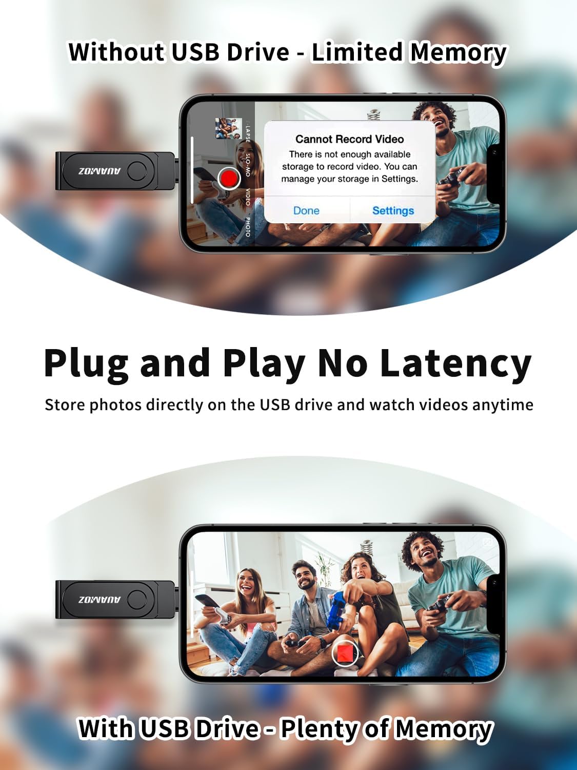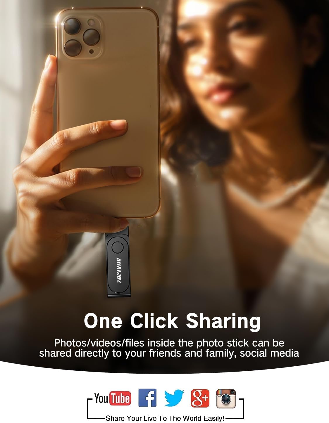 - 【Watch Movies, Photos and Play Music Directly From Phone Flash Drive】Store your favorite videos, audios and music on your iPhone's Photo Stick, then seamlessly plug and play on your iPhone or iPad anytime, anywhere. No more need for Internet or WiFi. This iPhone storage device plays videos in many different formats.Pictures stored on the Phone storage device also support different formats. Great way to store all your pictures and videos on an phone external storage device.