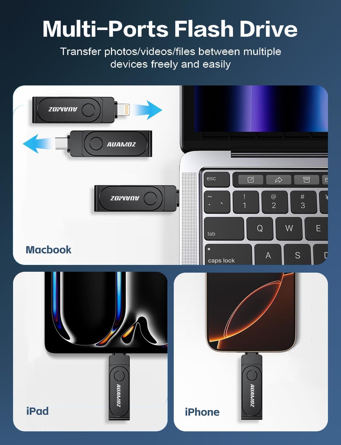 - 【Multi-Port USB Drive】The 3 IN 1 phone photo stick with USB-C Port/ USB-L Port/ USB Port (Independent interface), which is more convenient for data transfer between different devices, so as to get rid of the data cable and iTunes and iCloud, let you switch easily storage space. The Phone thumb drive is designed for use with a wide range of devices, Compatibility iPhone 16/15/14/13/12/11/8/7/6S/SE/XR/XS/XS Max/X Series/iPad Air Series/iPad Pro Series. Also support Android smartphones/Computers and other devices with USB-C Ports. (Tip: For iPhone system version requires iOS 13 or higher, For Android smartphones need to open OTG function)