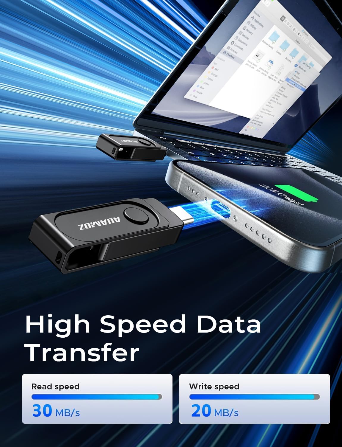 - 【High Transfer Speed】Transfer photos, videos, and files in seconds with our USB stick. With a write speed of up to 15 MB/s and a read speed of up to 30 MB/s, our flash drive for iphone have higher performance than conventional usb storage flash drive. Save time and get more done with iphone photo storage stick. Enjoy the whole relaxing trip with never stuttering or buffering video play on the go. (Tip: No Third-Party Apps Required, Simply insert the flash drive into the iPhone iPad and go to "Files" app)
