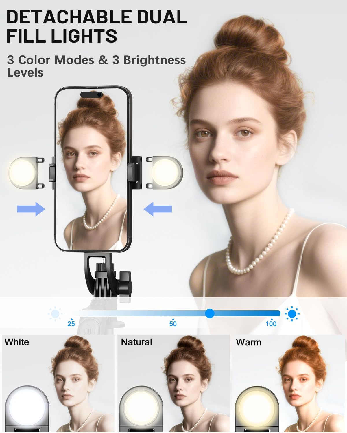 - 【Detachable Fill Lights & Smart Remote】This content creator essential tripod with light features dual detachable mini LED fill lights, with 3 color modes (Warm/Cool/Natural) and 3 brightness levels to enhance low-light shots. Studio-grade lighting control lets it adapt effortlessly to diverse scenes and moods. Also included is a Bluetooth remote (33ft range) for wireless shutter control, plus Type-C rechargeability for on-the-go use.