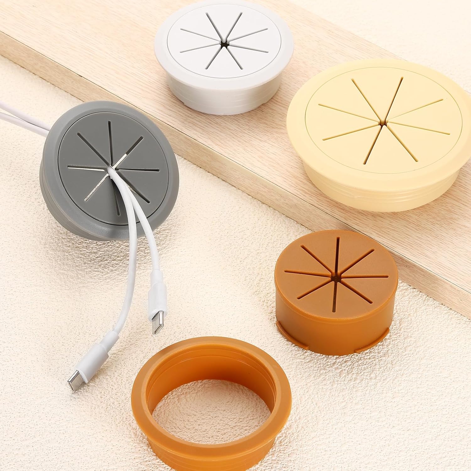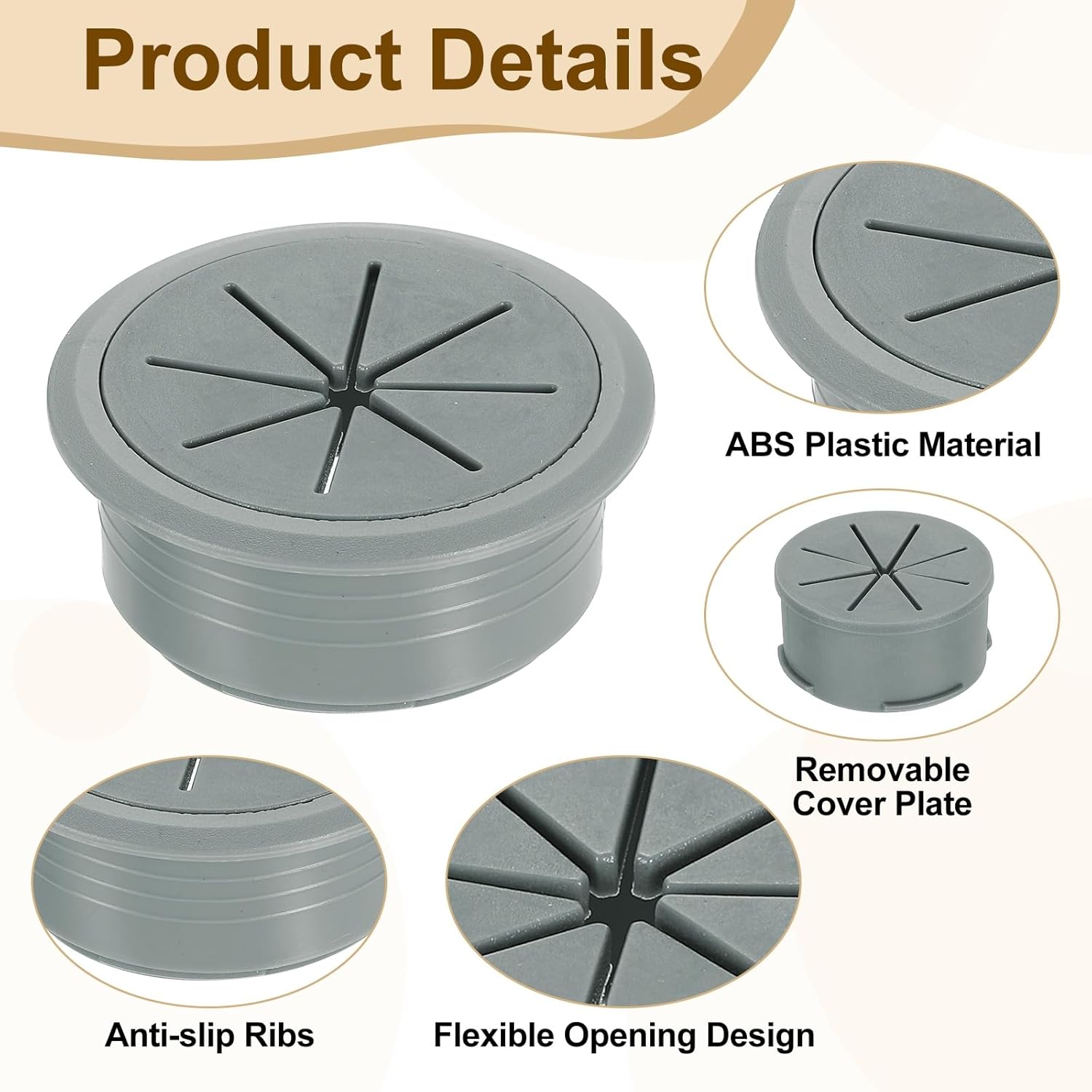 - [Function] - The desktop grommet is usually used to cover the desktop holes for wire management, protect pipes or wires from scratches on rough corners or surfaces, and provide a clean and organized working environment. It is designed with a removable cover plate for easy use or removal and has anti-slip ribs, making it tight. The flexible opening design on the top can accommodate wires in multiple directions, preventing them from scattering