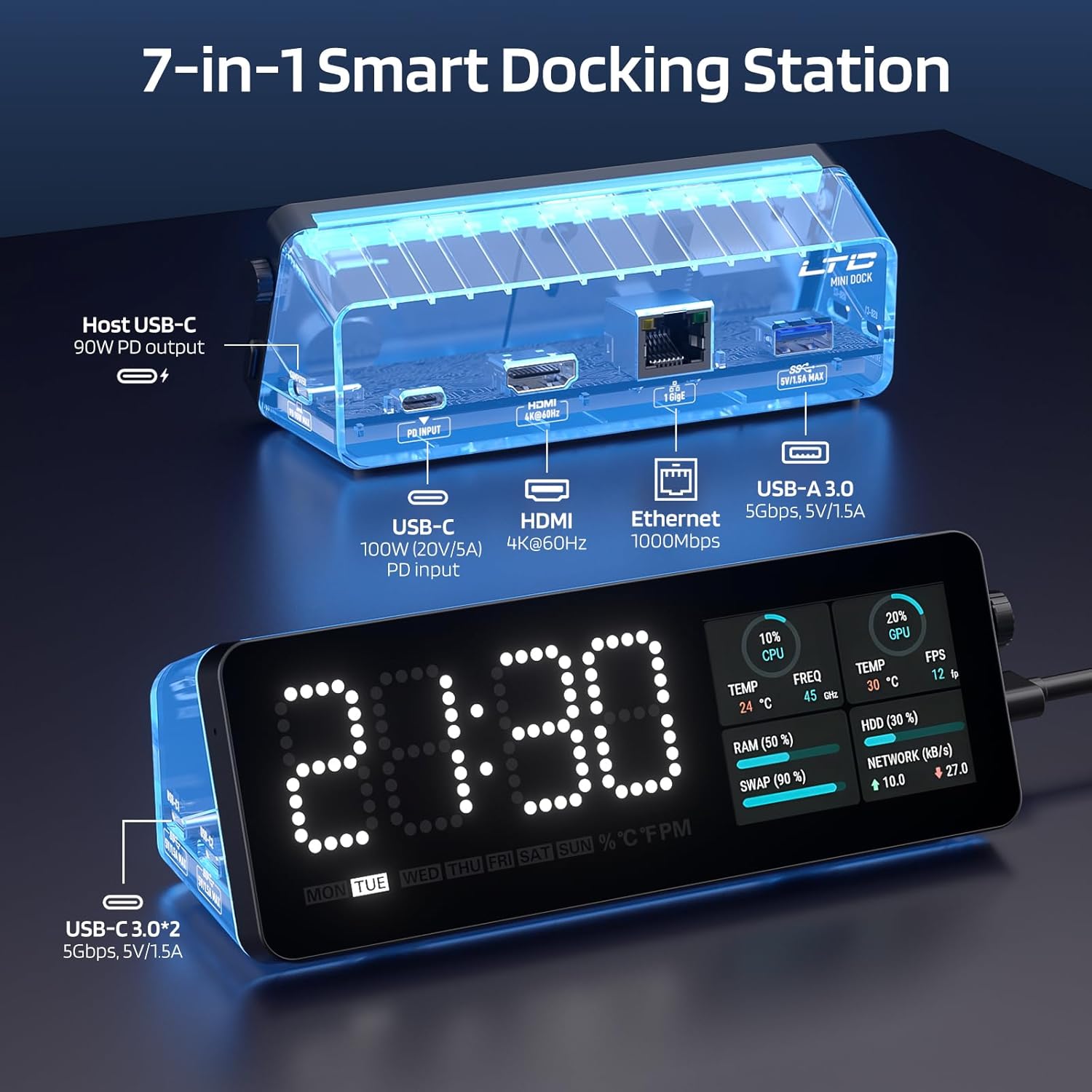 - 7-in-1 USB-C Hub Mini Docking Station: This compact multi-port adapter is equipped with an LED screen, a 4K@60Hz HDMI port, 90W Power Delivery (PD) charging, 1 Gbps Ethernet, and three USB 3.0 ports (up to 5 Gbps). With true plug-and-play functionality, connect everything with just one USB-C cable.