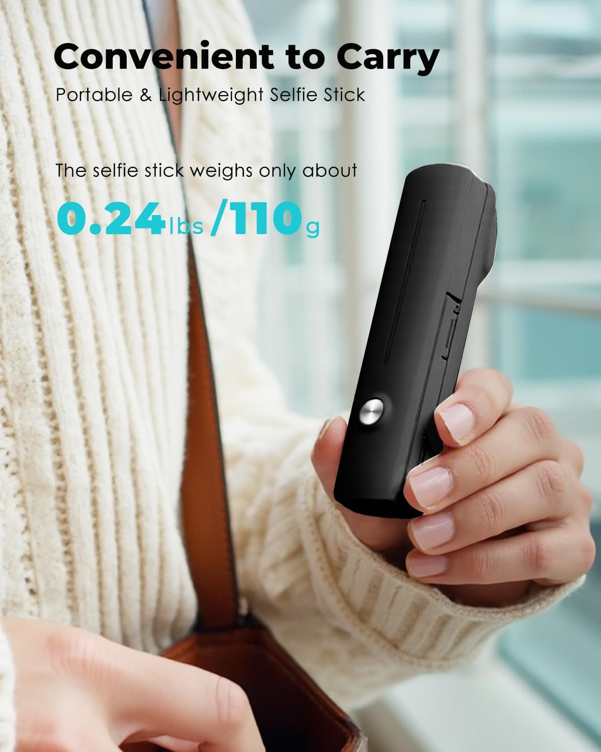 - 【Adjustable Length & Super Lightweight】This compact phone selfie stick is easily adjustable, extending up to 26.38 inches in length. When folded, it’s just 1.2x 1.9x 4.7 inches, fitting perfectly into your pocket or bag. Weighing approximately 0.24lbs /110g, it’s a portable stand ideal for travel. Use it as a selfie stick for iPhone or Android, Great for vlogging, live streaming, or photography. Its compact size makes it perfect for capturing photos on the go.