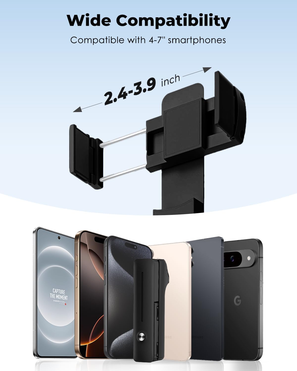 - 【Wide Compatibility Selfie Stick】This versatile selfie stick is designed to work with smartphones between 4 and 7 inches, Compatible with iPhone 16/15/14/X/12/13/13 Plus and Pro, Galaxy S10, LG G7, Ulefone Note 6, and more. The adjustable pull clip ranges from 2.4 to 3.9 inches, allows you to rotate the phone horizontally and vertically. Whether you’re using it as a selfie stick for iPhone, a mini selfie stick for seamless photos, or a photo stick for iPhone to capture stunning shots, it securely holds your device in place.