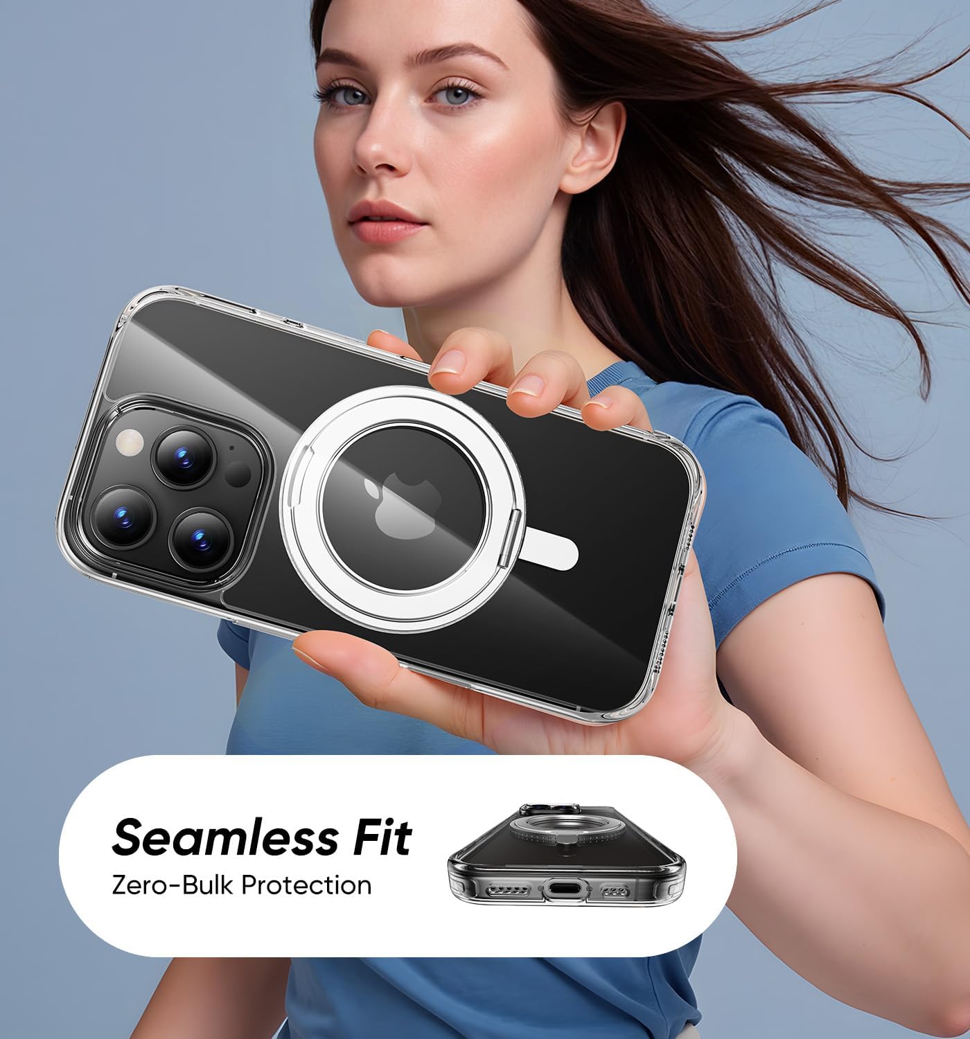 - [360° Seamless Kicktand] Designed for iPhone 15 Pro case incorporates an innovative invisible stand design offers a wide range of angles from 40 to 120° horizontally and vertically, with 360° rotational flexibility. Made with strengthened Aerospace-Grade Aluminum, it withstands over 30,000 open/close authoritative tests while remaining as sturdy as new. When the kickstand is folded, the back is perfectly flush and seamless, adding no bulk. You won't even sense its existence when touching.