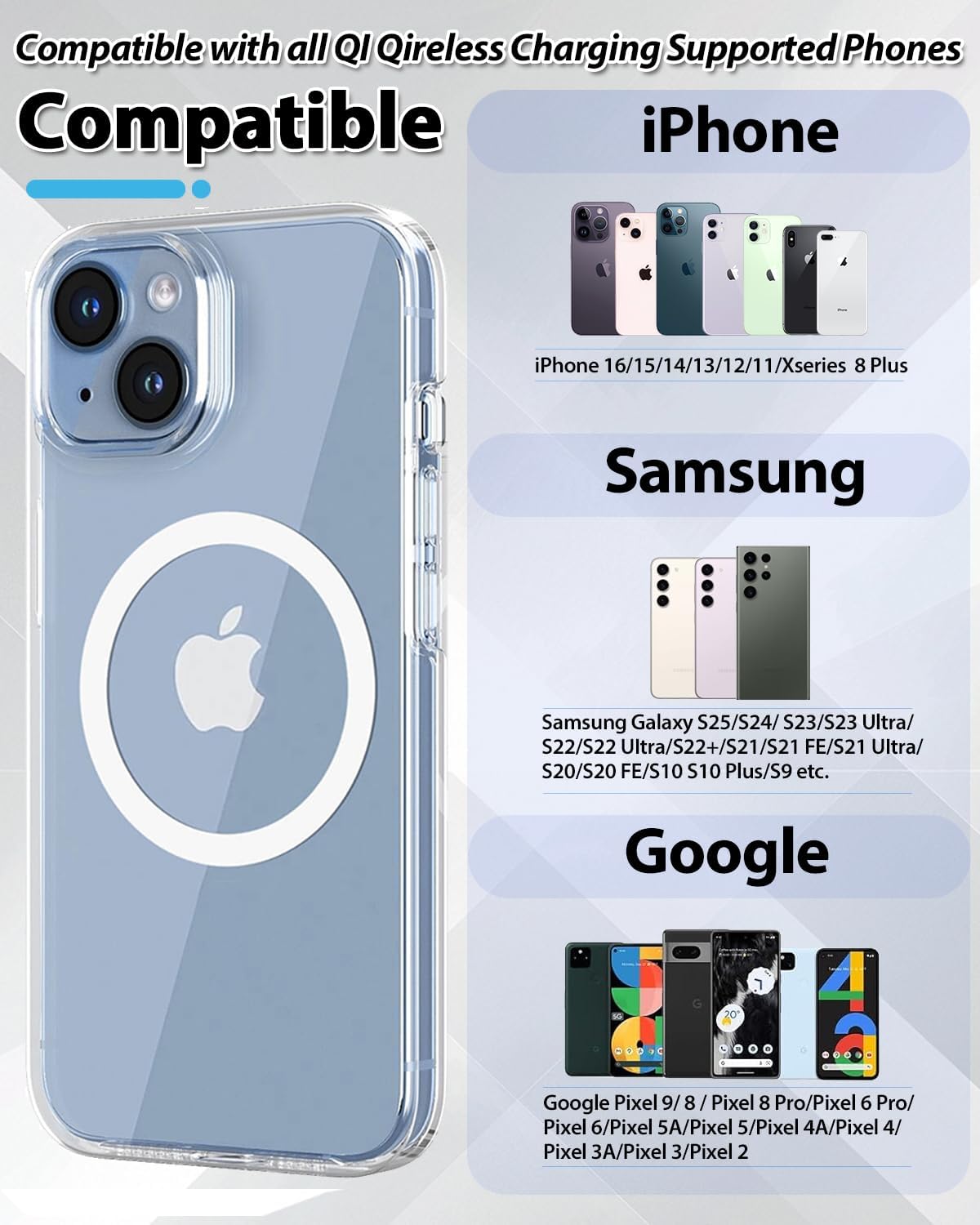 - [Works with any Wireless Charger]This for Magsafe ring is compatible with a variety of phones,and kindle, including iPhone 16/16 Plus/15/15 Plus/Pro/Pro Max/14/14 Plus/Pro/Pro Max/13/13 Mini/Pro/Pro Max/12/12 Mini/Pro/Pro Max/11/11 Pro/11 Pro Max/X/XS/SE/8/8 Plus, as well as android samsung Galaxy S8/S9/S10/S20/S21/S22/S23/S24, Galaxy Note8/Note9/Note10/Note20. It can also be seamlessly integrated with Magsafe accesories like card wallets, battery packs, and phone mounts.