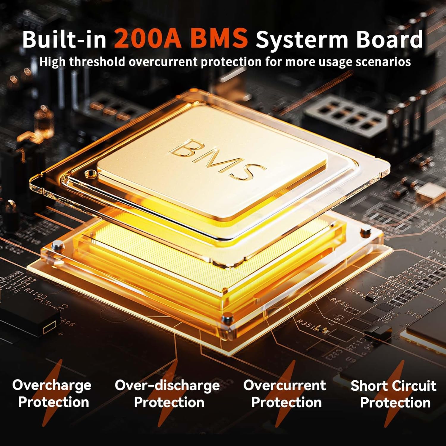 - đăALL ROUND PROTECTIONă: Built-in advanced 200A Battery Management System (BMS) allows the 12V lithium iron phosphate battery to self-protect and effectively resume operation, automatically preventing overcharge, overdischarge, overcurrent, short circuit, overload, aiming to maintain longevity and stability.