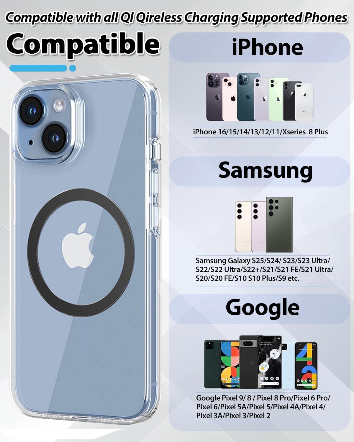 - [Works with any Wireless Charger]This for Magsafe ring is compatible with a variety of phones,and kindle, including iPhone 16/16 Plus/15/15 Plus/Pro/Pro Max/14/14 Plus/Pro/Pro Max/13/13 Mini/Pro/Pro Max/12/12 Mini/Pro/Pro Max/11/11 Pro/11 Pro Max/X/XS/SE/8/8 Plus, as well as android samsung Galaxy S8/S9/S10/S20/S21/S22/S23/S24, Galaxy Note8/Note9/Note10/Note20. It can also be seamlessly integrated with Magsafe accesories like card wallets, battery packs, and phone mounts.