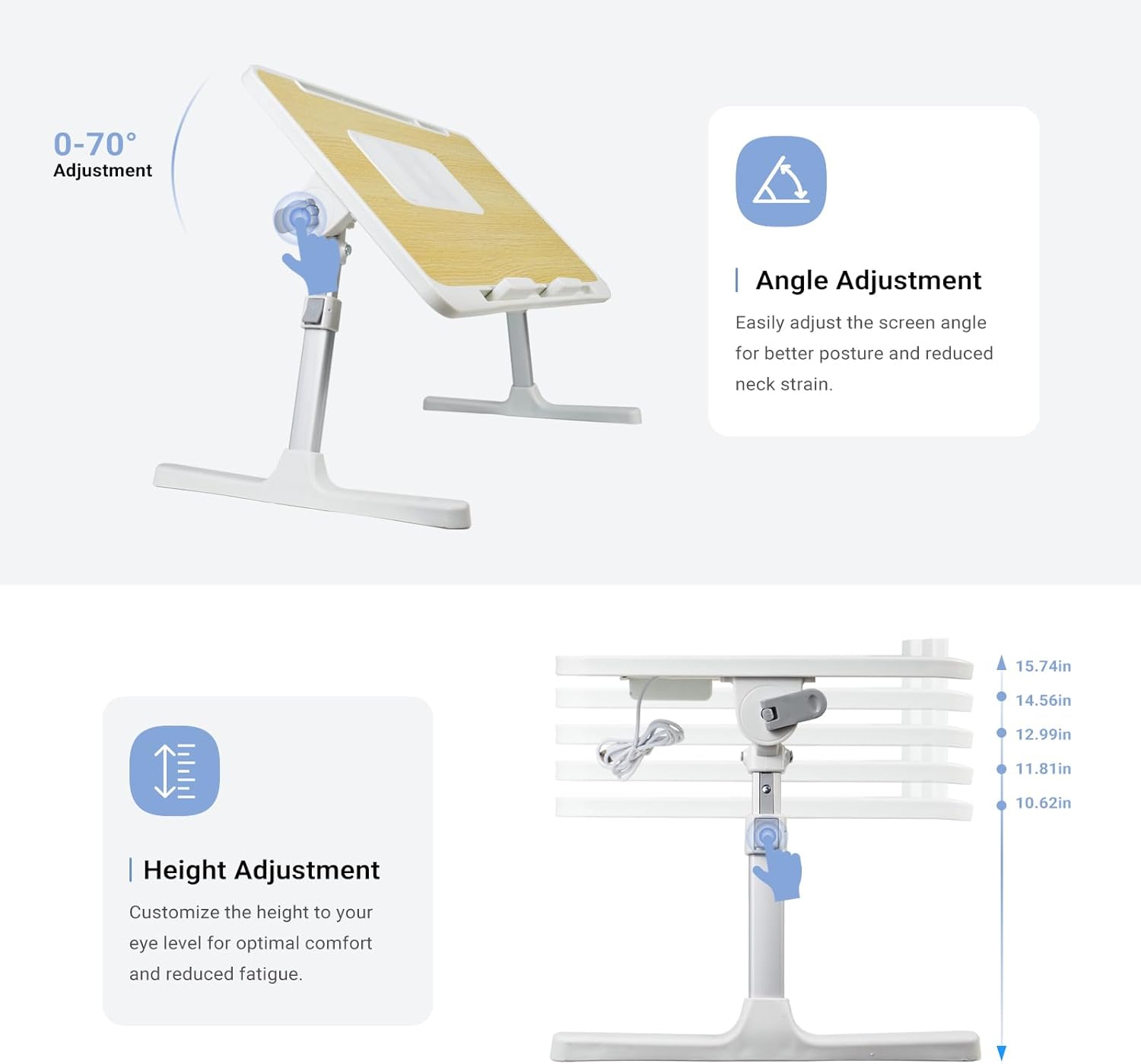 Laptop Lap Desk Include Cooling Fan,Adjustable Lap Desk with Light Fan,Folding Laptop Desk for Bed with USB,Bed Desk with Storage Drawer 60x40cm,White Oak