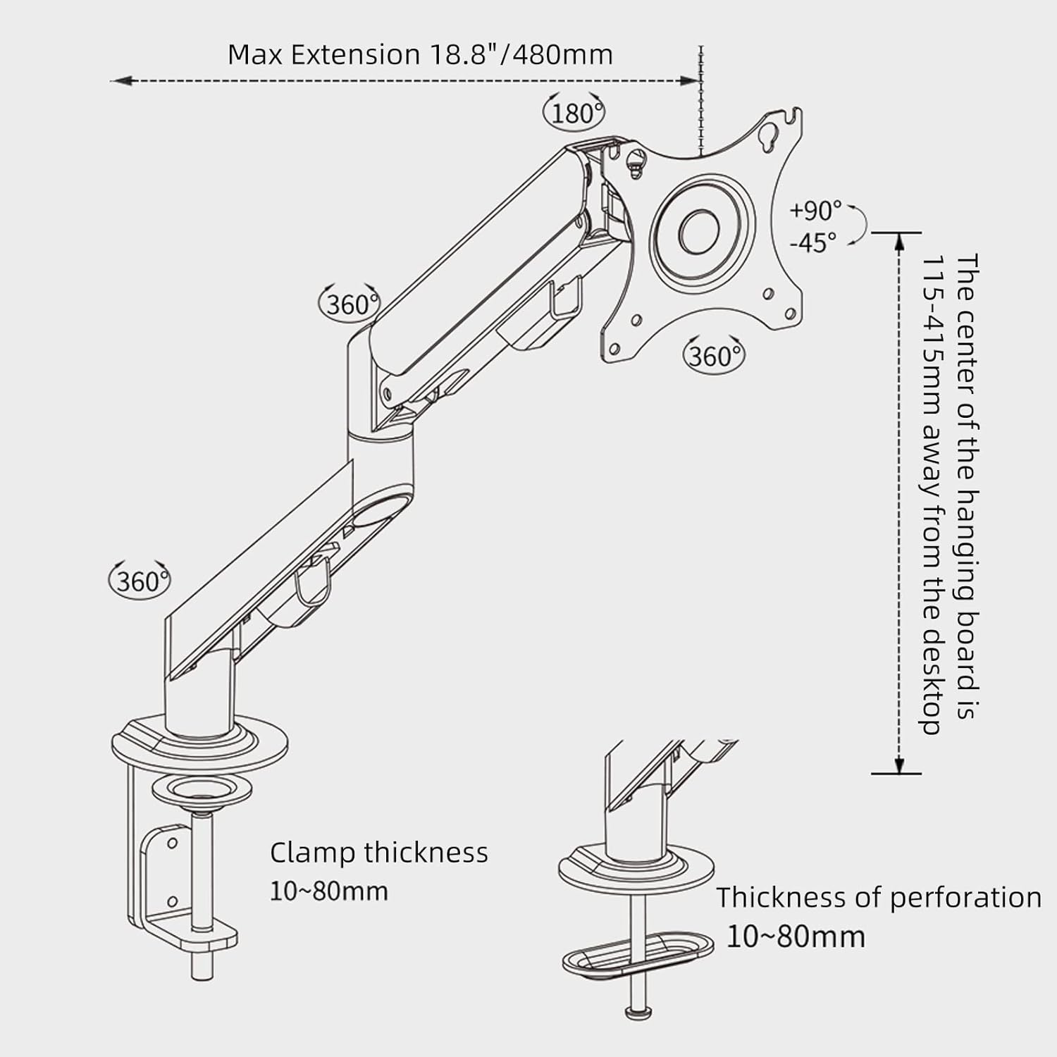- Ergonomic: The monitor desk mount can be angled to your heart's desire, offering a wide range of motion, ergonomically. This single monitor arm supports screen rotation 360°, Swivel 180°, and tilt angle from +90°~-45°. The stretch distance can reach 18.8". It greatly improves comfort and work efficiency.