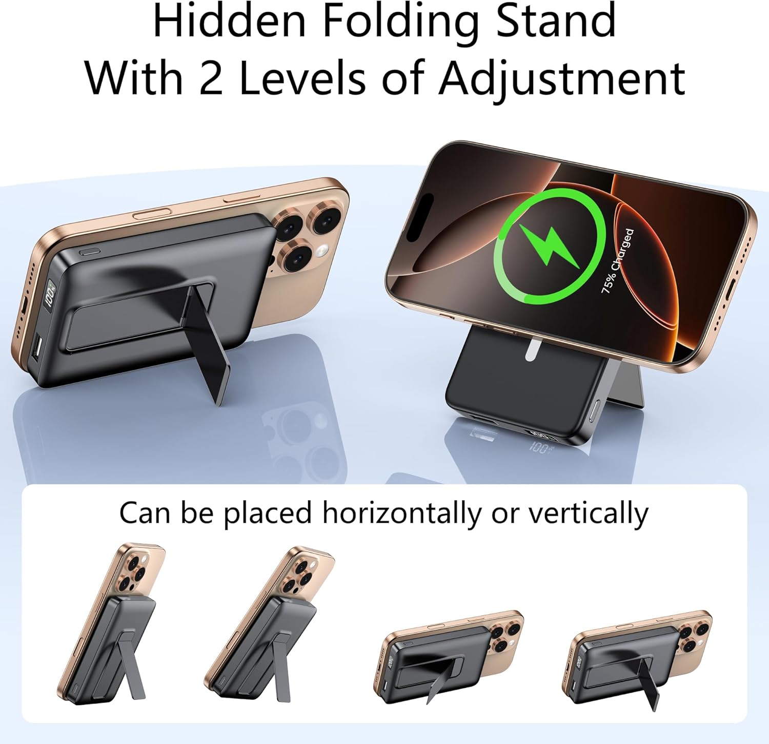 YUJE for Magsafe Battery Pack Magnetic Power Bank 10000mAh, Wireless Portable Charger with Foldable Stand Dual USB-C & USB-A Port Fast Charging Compatible with iPhone 16/15/14/13/12 Pro/Max/Plus
