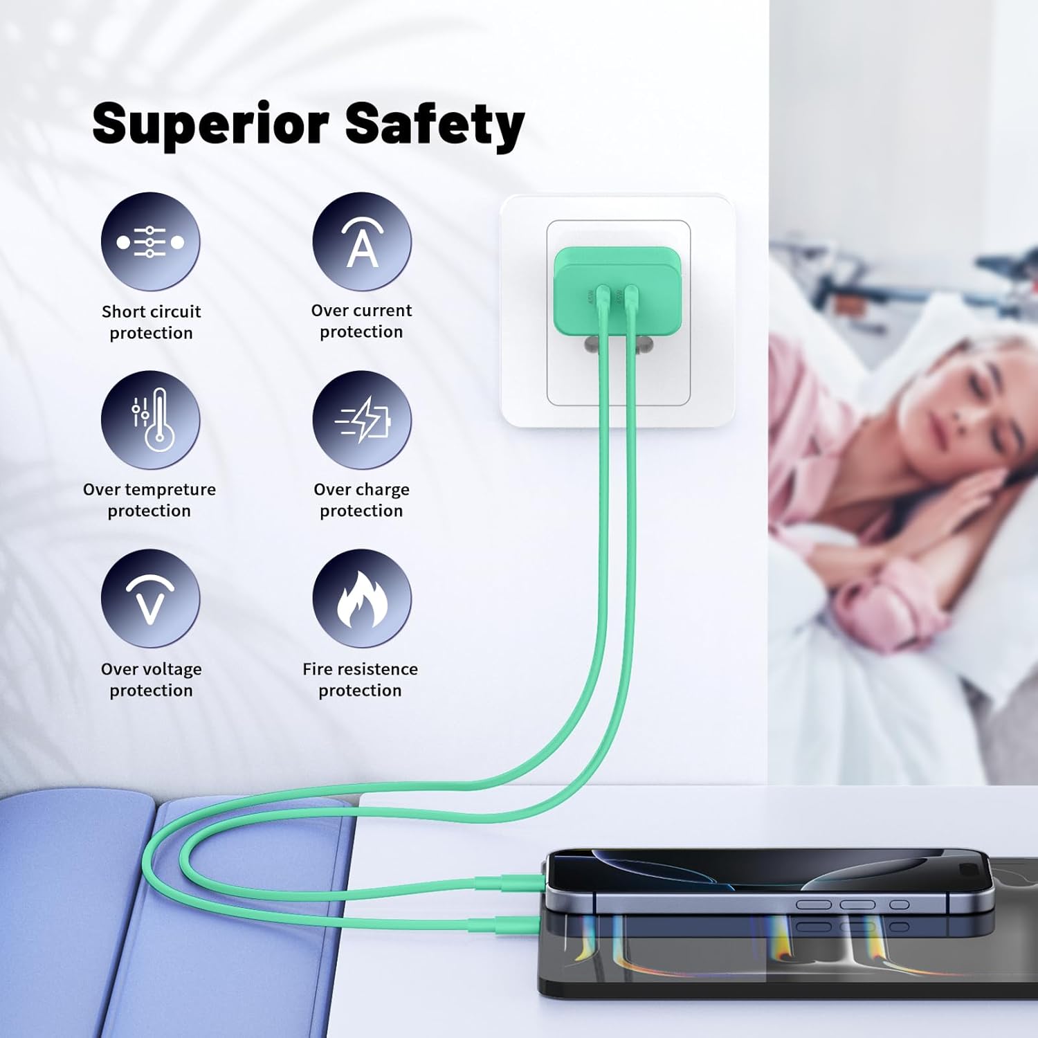 - 【45W iPhone 16 15 charger Fast charging 】 :The 45W iPhone 16 Fast Charger USB C Block with the 60W 10ft extra long USB C to USB C Fast Charger cable provides a maximum 45W output power, charging the iPhone 16 Pro Max up to 70% in 30 minutes, six times faster than the original 20W USB C charger. And the 45W charger uses a two-port design, two ports can quickly charge two devices at the same time, up to 45W, up to 45W when a single device is connected.