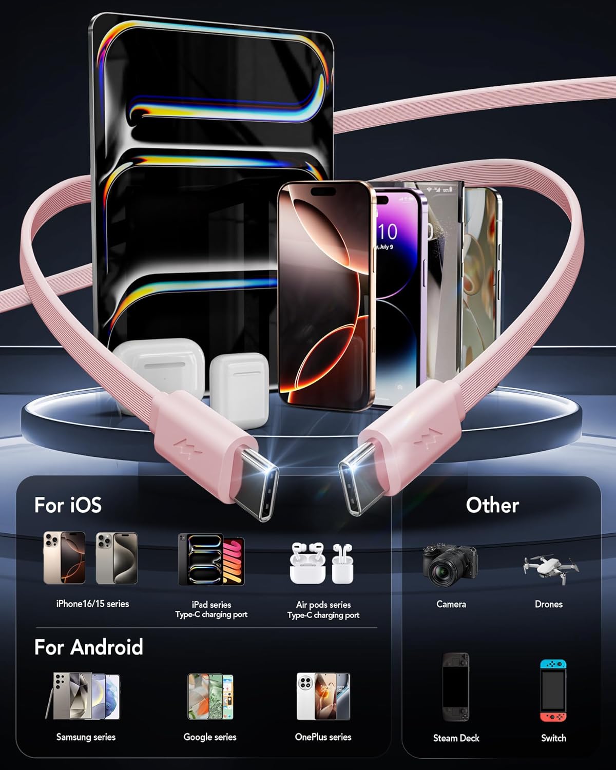 - 【90cm Retractable Cable for Maximum Convenience】The retractable wall charger block comes with two 90cm retractable Type-C cables. The maximum retractable length of the charging cables is 90cm (35.5 inches), perfect for charging Android phones, tablets, or laptops with USB-C ports. The cables are neatly stored, and after unplugging, you only need to gently stretch 1cm to retract them.