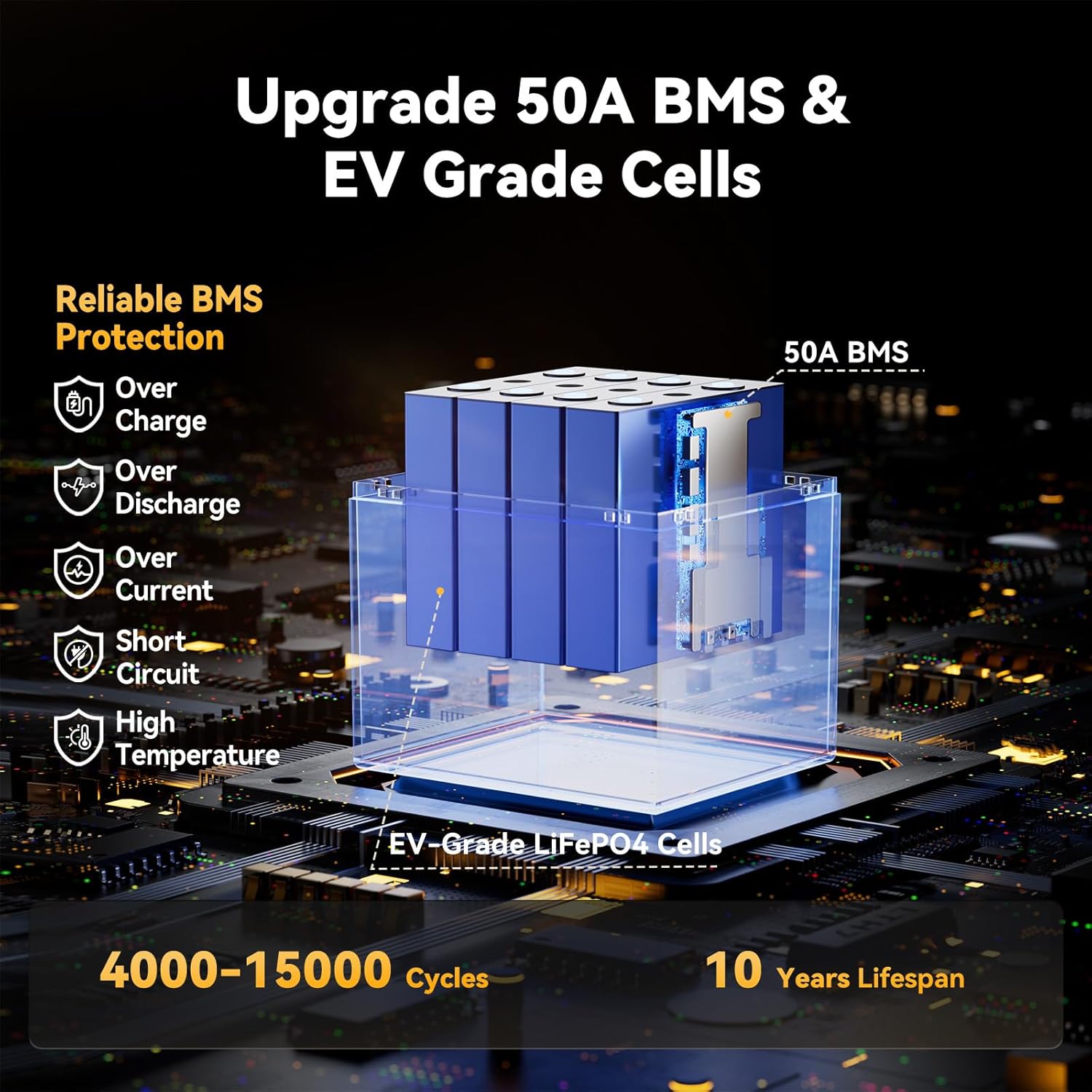 - 【BUILT-IN 50A BMS & 2-Hour Fast Charging】Our 12.8V 50Ah Lithium battery build in 50A BMS, which can prevent the LifePO4 battery from the most common issue causing of battery failure, such as overcharge, over-discharge, over-current, overheating, short circuit. The BMS also support 0.5C (25A) charger that needs only 2 hours to charge 50Ah battery fully compared to Lead Acid needs 10~11 hours to fully charged which only support 1A~10A charger.
