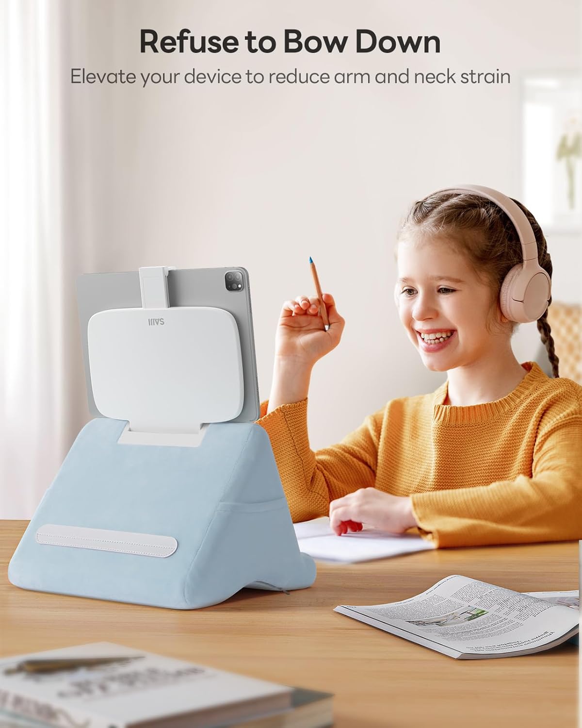 SAIJI Tablet Kindle Stand Pillow - iPad Holder for Lap Reading in Bed, with Lifter & Angle Adjustable Multi-Function Clip for 4-13" Tablets, iPad, Kindle, Phone, Blue