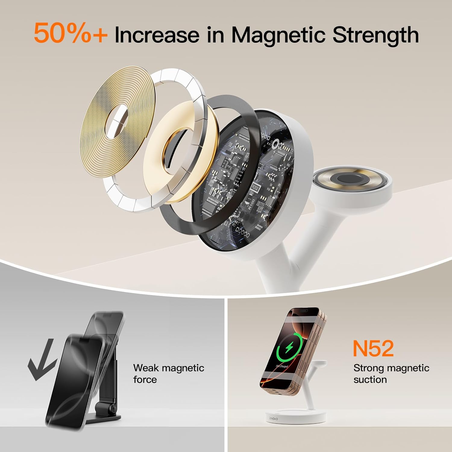 - 【Wireless Charging Strong Support Design】: The wireless charger stand increases the sturdiness and stability of the base, optimizes the support structure, and will not break. At the same time, the phone charging part of this magnetic wireless charging station has optimized tilt angle and will not block the camera of iPhone16/15/14/13/12 Pro Max, making viewing the phone more comfortable and enhancing the user experience