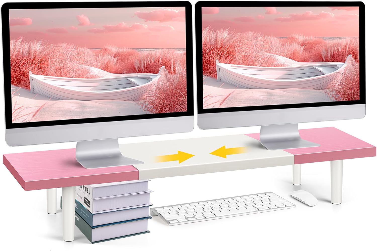 Dual-Monitor-Stand-Riser-For-Desk Adjustable Length 32-40 Inch,Large Desktop Computer Monitor Riser For 2 Screens,Desk Shelf Organizer Riser Stand For Computer/Laptop/PC/Printer/TV