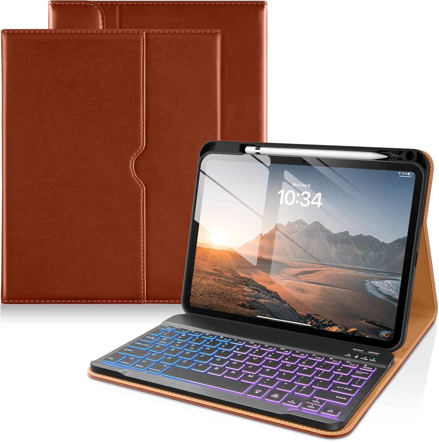 DTTO for iPad 11th (A16)/ 10th Generation Case with Keyboard (2025/2022), 7 Colors Backlit Wireless Detachable Keyboard Leather Folio Cover with Pencil Holder & Pocket, Brown