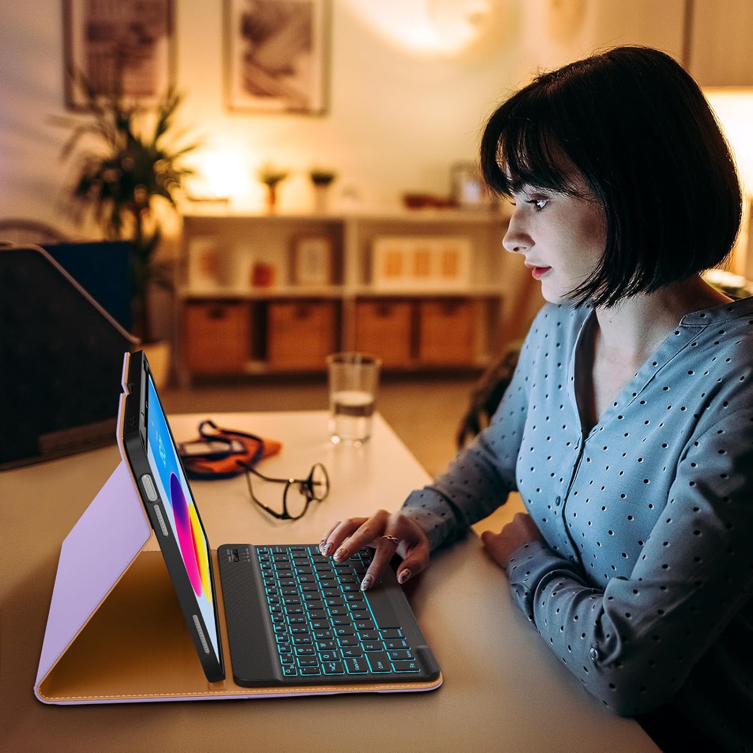 DTTO for iPad 11th (A16)/ 10th Generation Case with Keyboard (2025/2022), 7 Colors Backlit Wireless Detachable Keyboard Leather Folio Cover with Pencil Holder & Pocket, Lavender