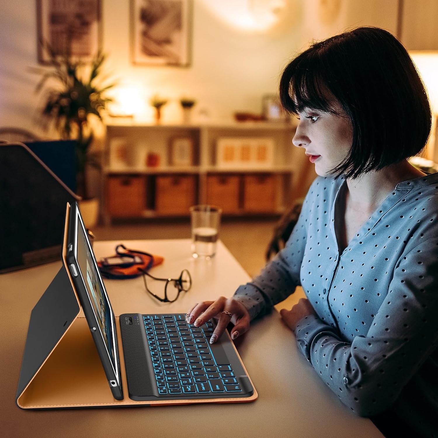 - 【7 Colors Backlit Keyboard】This for iPad 9th generation case with keyboard is designed with laser-etched backlit keys that allow 7 vibrant colors to shine in the dark. Ergonomic and mechanical scissor keys with rebound feature to reduce noise