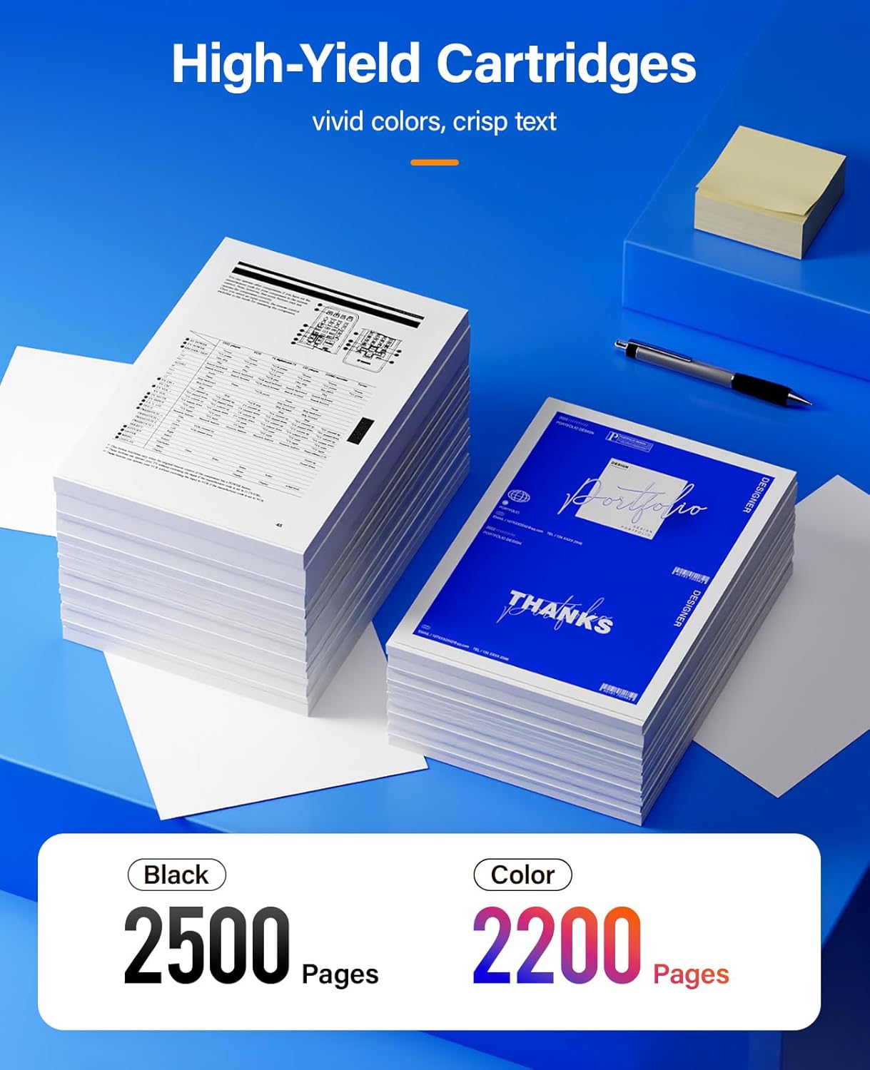 - Page Yield: Up to Black is 2,500 pages per black cartridge and Color is 2,200 Pages per color cartridge (Letter/A4, at 5% Coverage).
