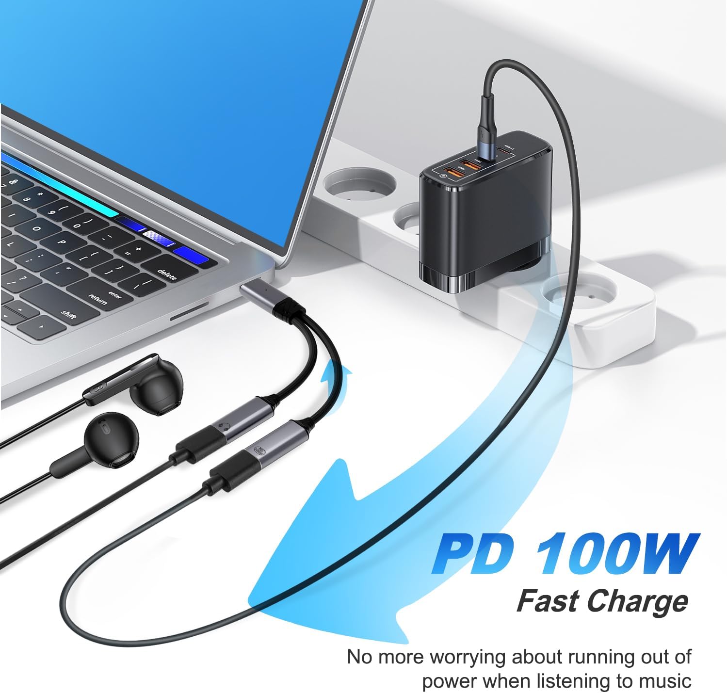 - USB C to Headphone & USB C to Charging Adapter:This USB C to Dual USB C earphone jack adapter that supports USB TYPE-C headphone and PD 100W USB C Fast Charging, allowing you to enjoy music and charge your phone at the same time