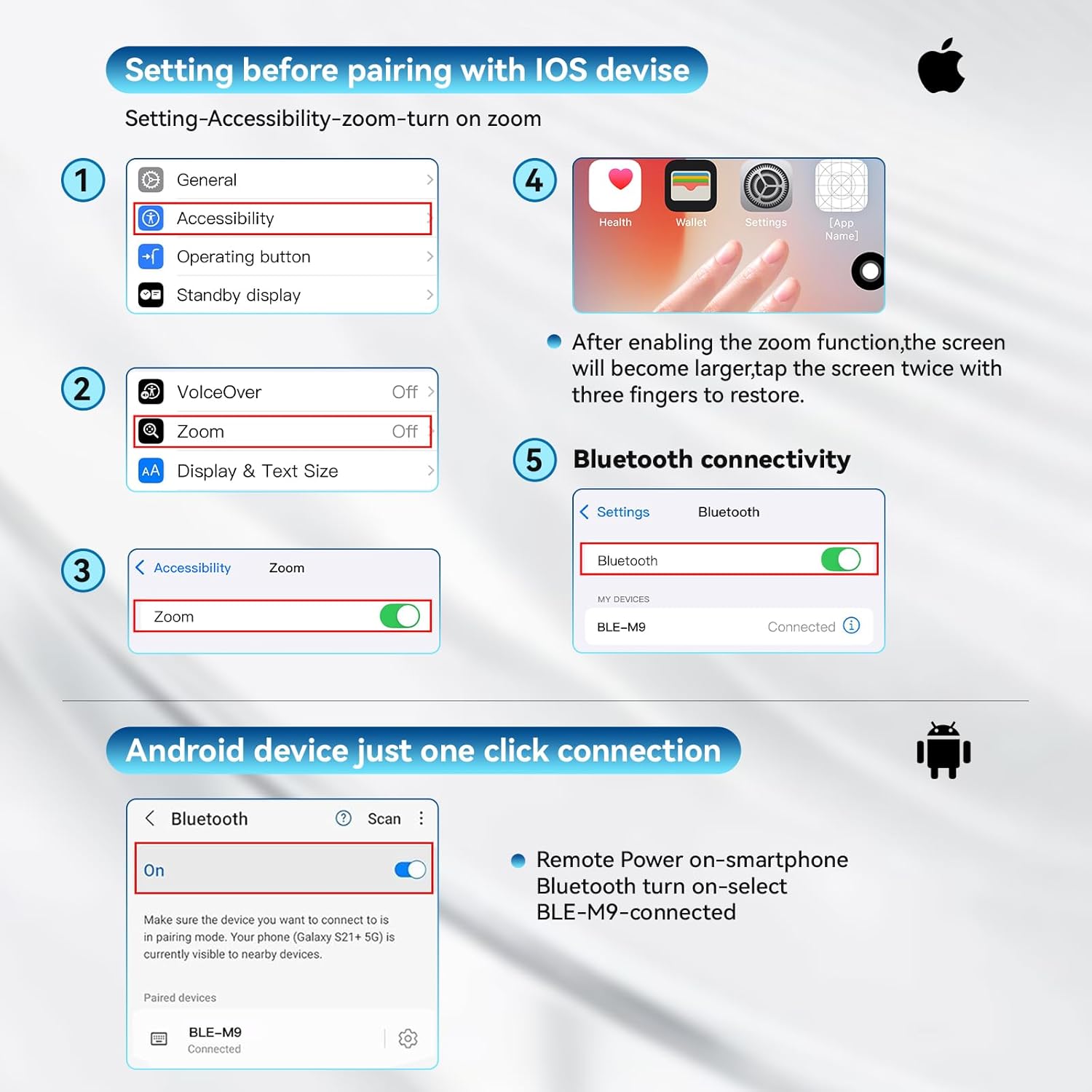 - 【Wireless Remote Control for short video】you can use the Bluetooth Scrolling Remote Control to Swipe the next/previous video, give a like, Volume +/-, left and right Swipe. Hands-free Operation with this Bluetooth remote control. iOS devices Settings: Open setting>Accessibility>Zoom>Turn on Zoom>Using three finger twice click the screen to restore, then you can connect the remote via Bluetooth. Note:Only for Tiktok, not work well with other short video APPS.