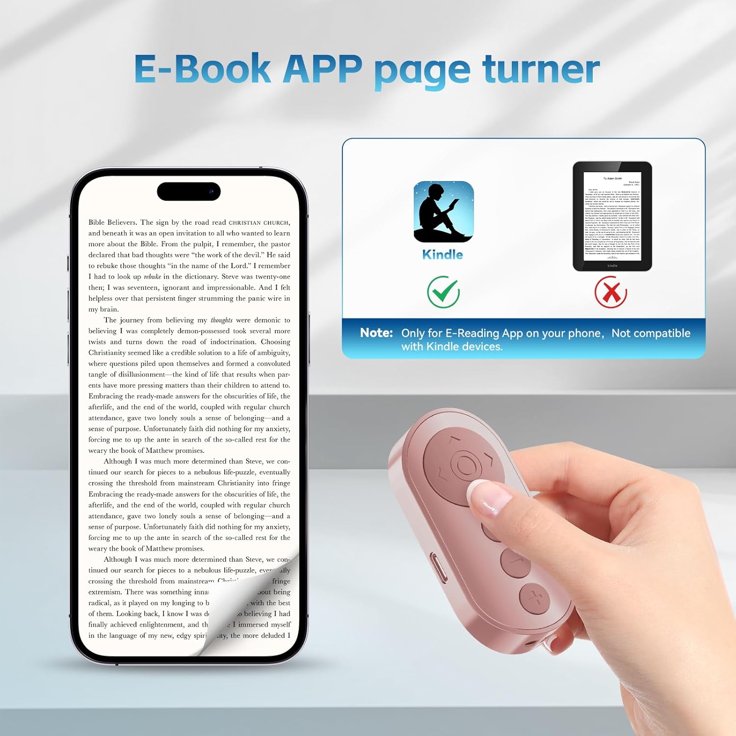 - 【E-Book App Page Turner】This wireless remote can help you control the page-turning of the E-book APP, and enjoy a comfortable reading experience. Note: ONLY available for e-book APP on Smartphone, not work for Kindle devices or any E-reader device.