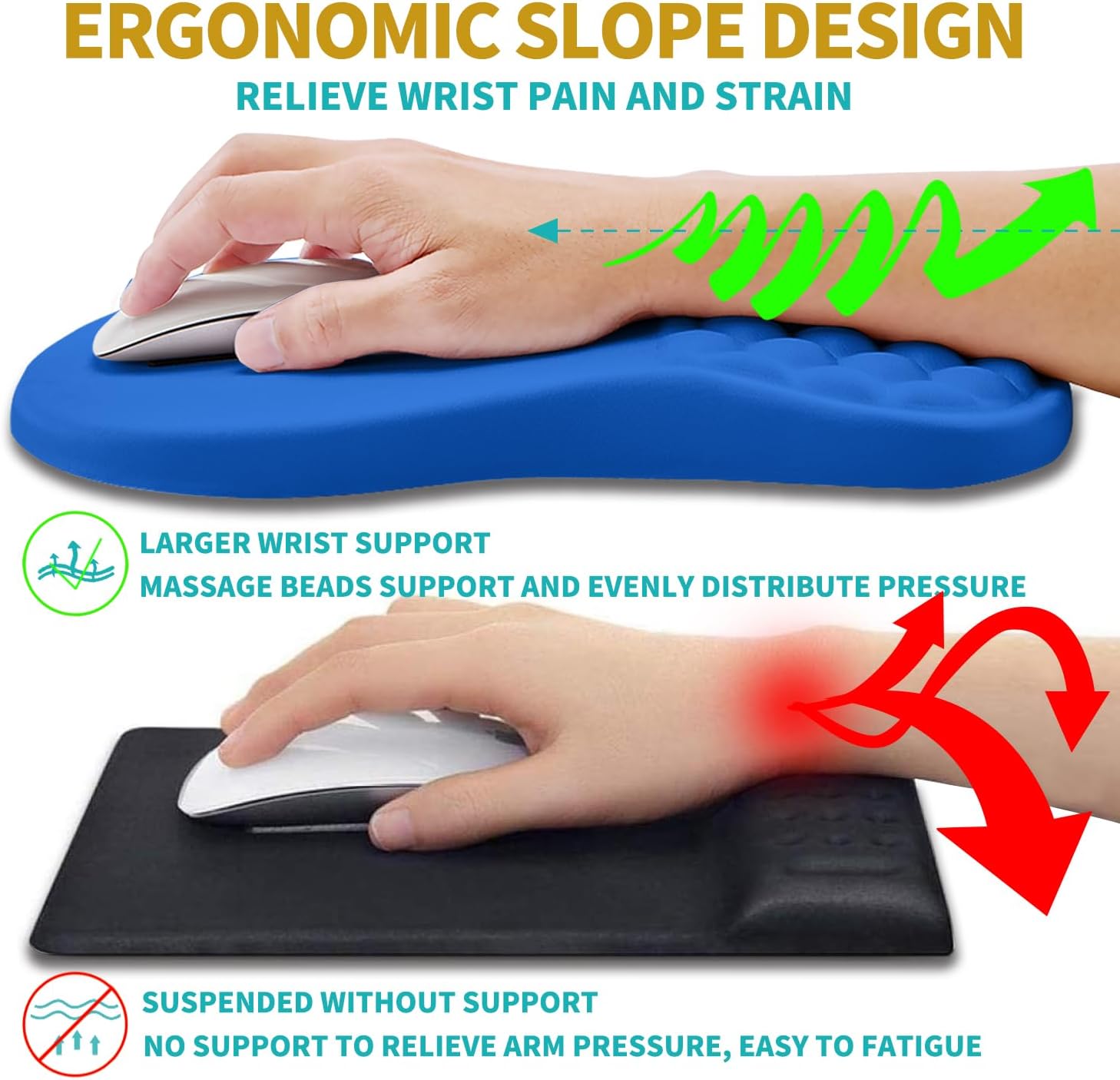 - 【Ergonomic Massage Design】The innovative ergonomic slope and massage bump design perfectly support the wrist and palm. Massage bump design can effectively relieve wrist pain and fatigue, improve carpal tunnel syndrome (CTS), strengthen the air circulation between wrist and mouse pad, prevent sweating, and keep your wrist in the most comfortable state.