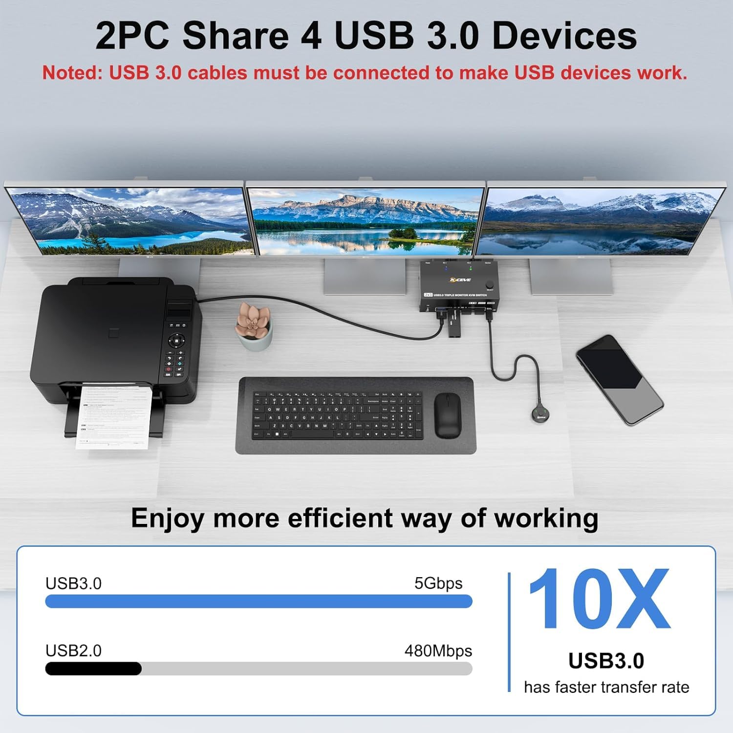 - 【KVM Switch 3 Monitors 2 Computers】The KVM switches allows 2 computers share 3 monitors and 4 USB3.0 devices. Support extended and copy display mode. Extended Mode: Computers host in output 3 different images on 3 monitors. Copy Mode: Computer host outputs 3 identical images on 3 monitors.(Note:Requires 2 Displayport +1 HDMI ports for each connected computer and make sure your PC supports multiple monitors).