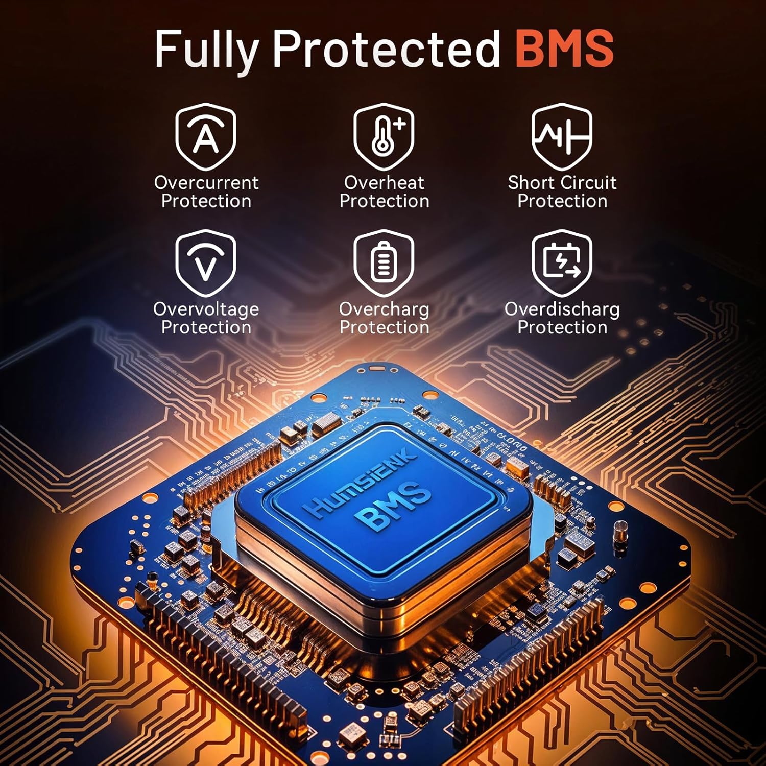 - 【Built-in 100A BMS – Safe & Maintenance-Free】The advanced Battery Management System (BMS) offers overcharge, over-discharge, overcurrent, and short-circuit protection, ensuring long-term safety and stability. A high-temperature cut-off prevents charging above 158°F (70°C), making it safer than lead-acid alternatives. Perfect for both indoor and outdoor applications.