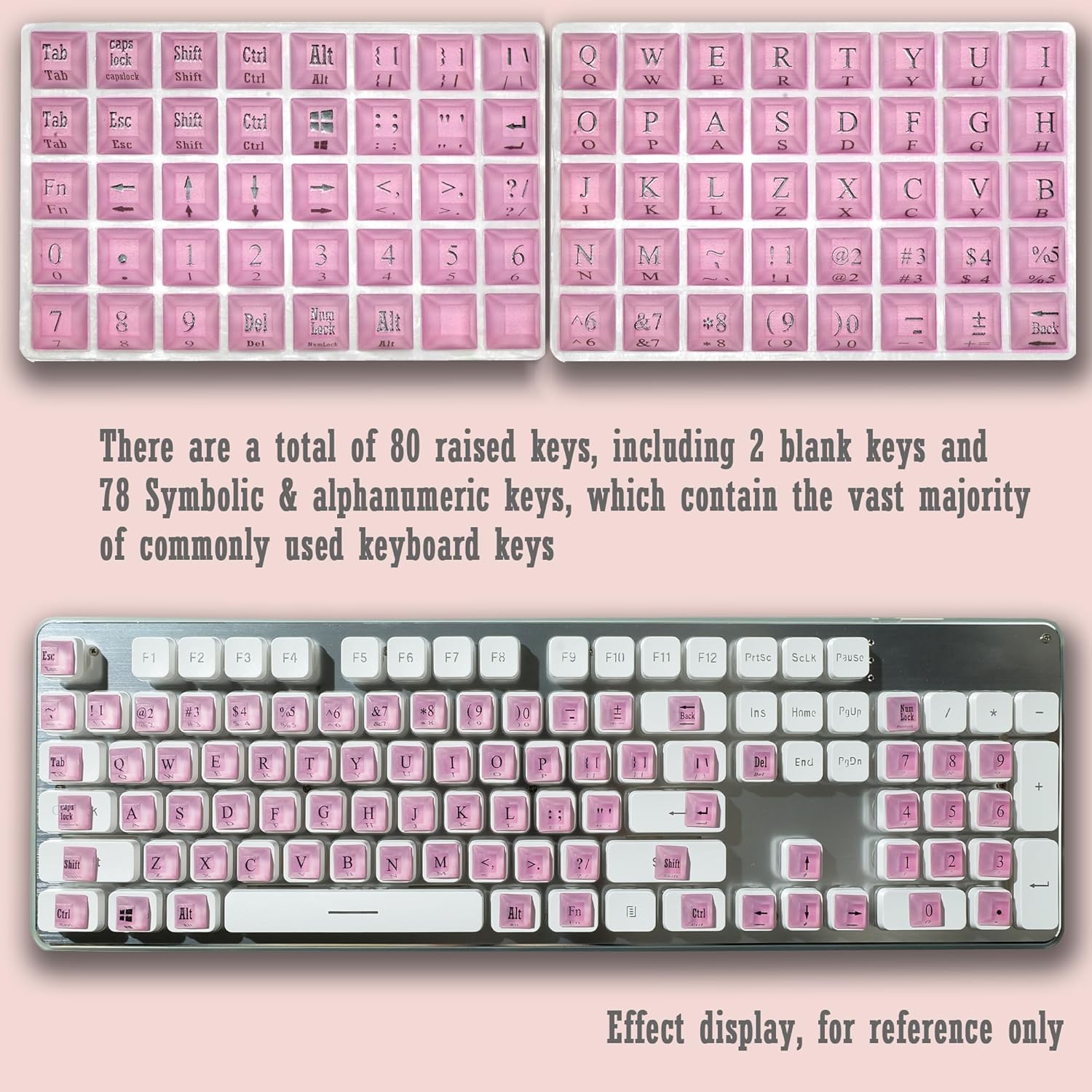 - SMOOTH APPLICATION These raised key buttons are easy to install by pulling them off the sheet and placing them onto the coordinating keys. It also come with installation manual and redundant adhesive dots, ensuring 100% effectiveness even after multiple installations or installation on extremely concave keyboard keys.