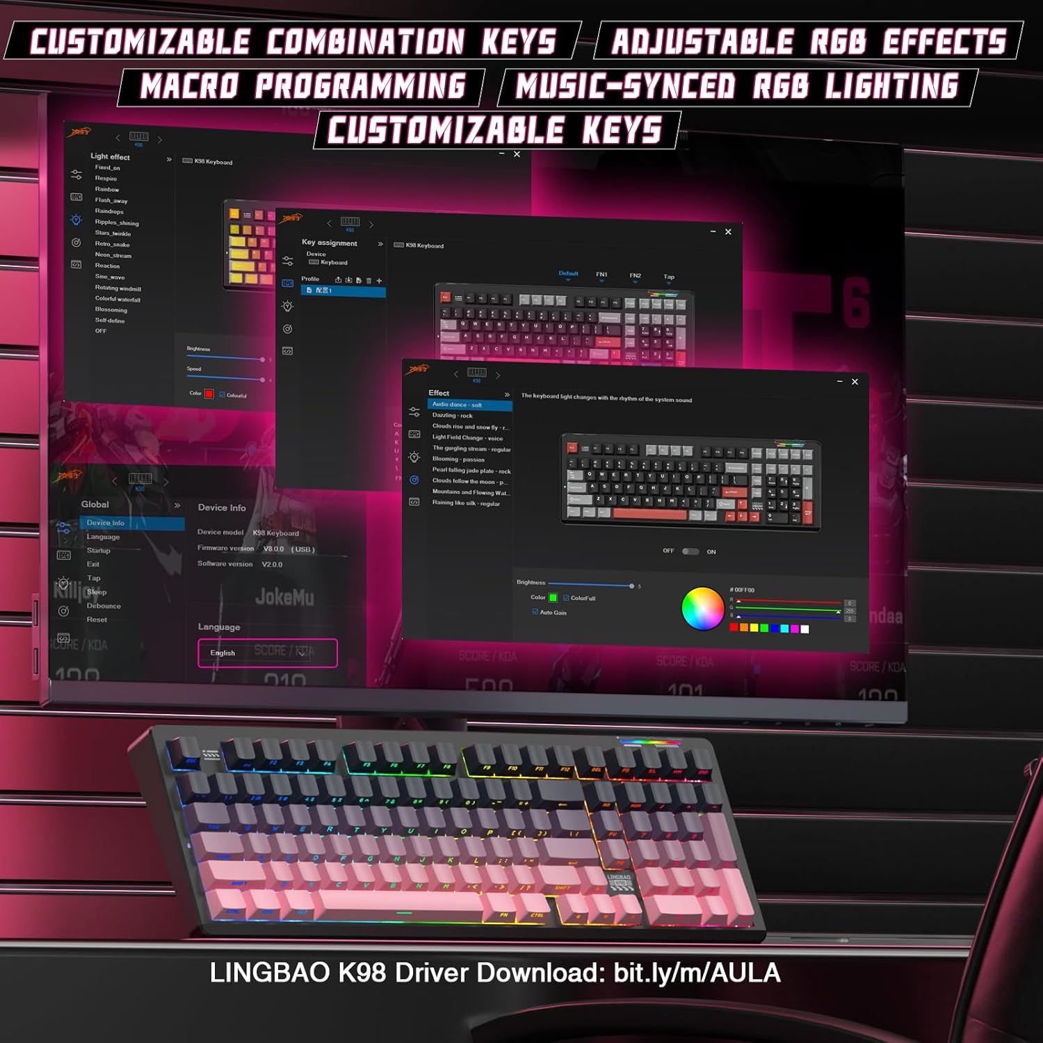 - Full Customization via Dedicated Software: Take full control of the LINGBAO K98 with intuitive software — customize RGB lighting, program macros, and record or edit complex key sequences for faster execution. Synchronize lighting effects with your favorite music, create personalized shortcuts, and enjoy full N-Key rollover for flawless performance during fast-paced gaming. Perfect for gamers, content creators, and professionals who demand both style and precision
