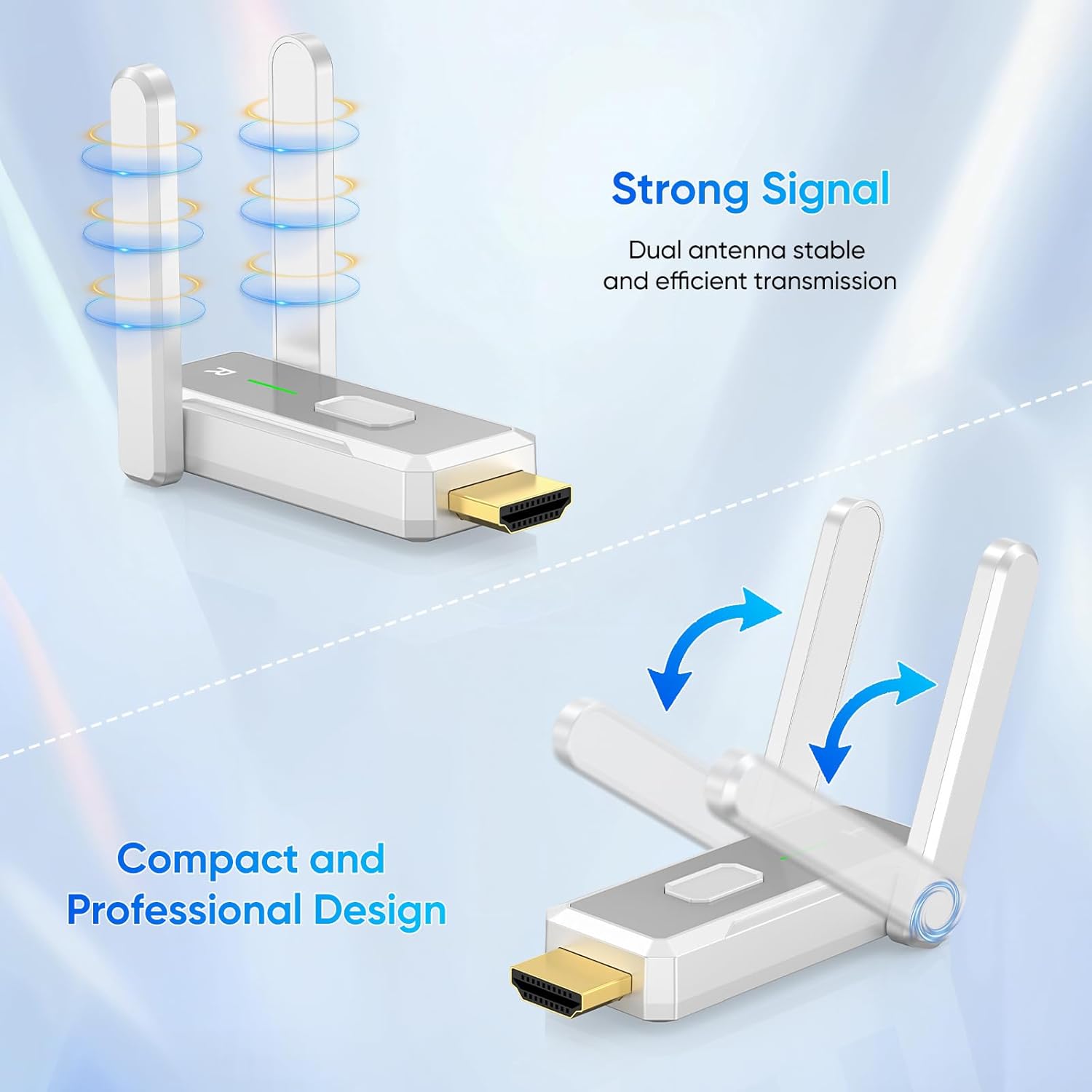 - Extended Range, Plug and Play : HDMI sender and receiver wireless equipped with a dual-antenna system that enhances signal penetration, it achieves a transmission distance of up to 500 feet/150 meters, catering to diverse needs in homes and offices. Flexibly arrange your home theater or conference room, freeing yourself from cable clutter, reducing costs and hassles, and eliminating worries about tangled wires, damage, or loose connections. Note: Transmission distance may reduce to 100 feet/30 meters when passing through walls.