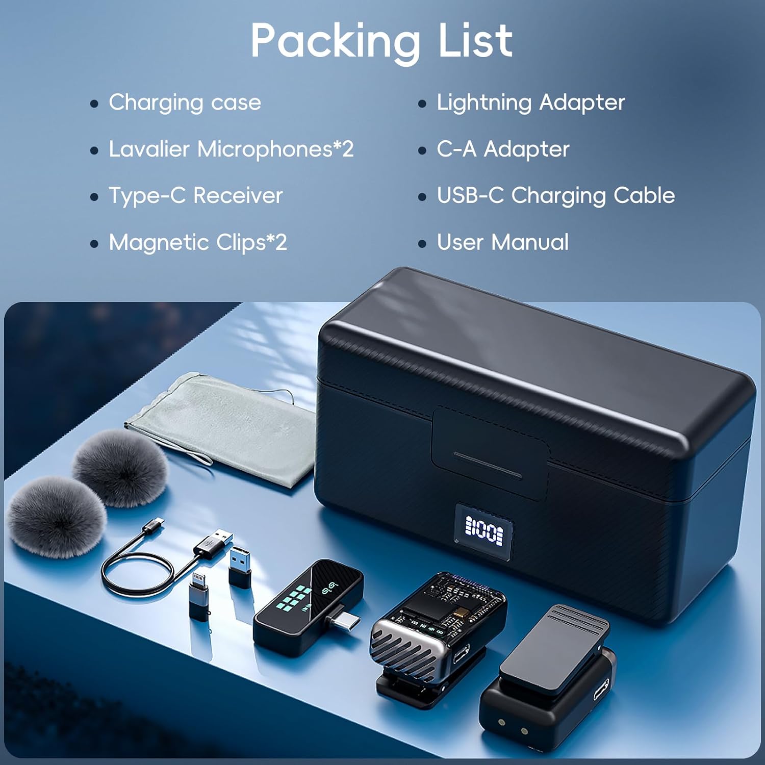 - Included Components : 1 C-A Adapter Cable, 1 Charging case, 1 Lightning Adapter, 1 Type-C Receiver, 2 Lavalier Microphones