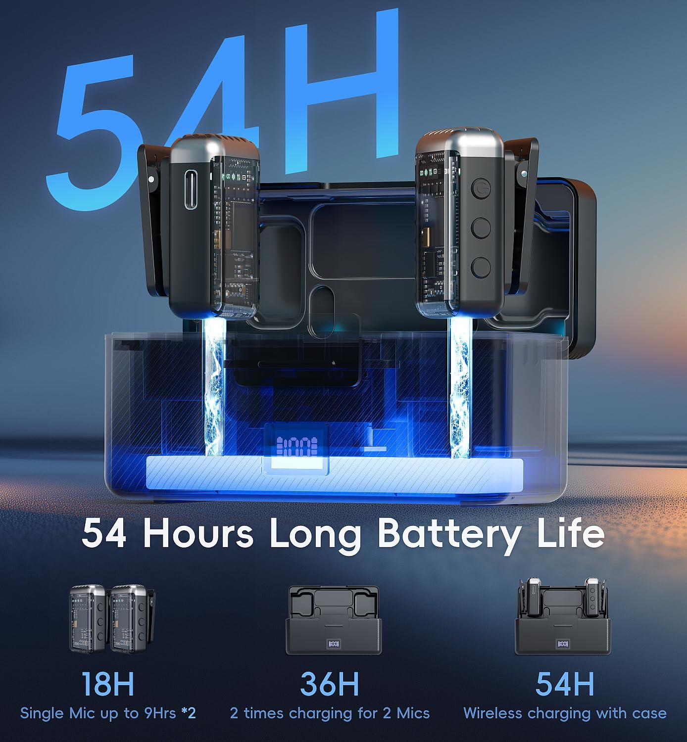 - 54 Hours Long Battery Life: The transmitter for lapel microphone wireless can last up to 9 hours. If one lapel mic battery runs out, you can use another fully charged mini microphone,2 times wireless charging for 2 Mics via charging case